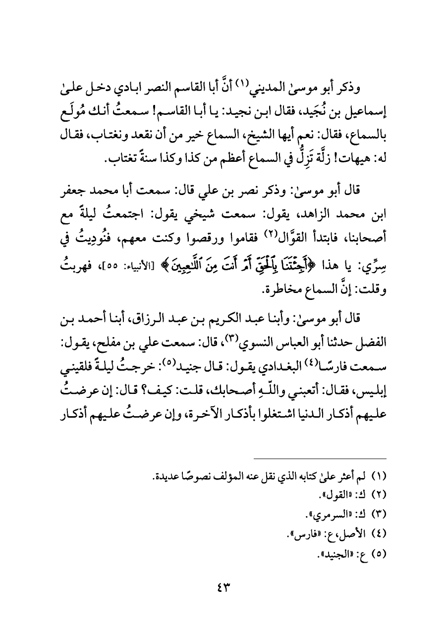 قال أبو موسى: وذكر نصر بن علي قال: سمعت أبا محمد جعفر ابن محمد الزاهد، يقول: سمعت شيخي يقول: اجتمعتُ ليلةً مع أصحابنا، فابتدأ القوَّال (¬٢) فقاموا ورقصوا وكنت معهم، فنُودِيتُ في سِرِّي: يا هذا {أَجِئْتَنَا بِالْحَقِّ أَمْ أَنْتَ مِنَ اللَّاعِبِينَ} [الأنبياء: ٥٥]، فهربتُ وقلت: إنَّ السماع مخاطرة.