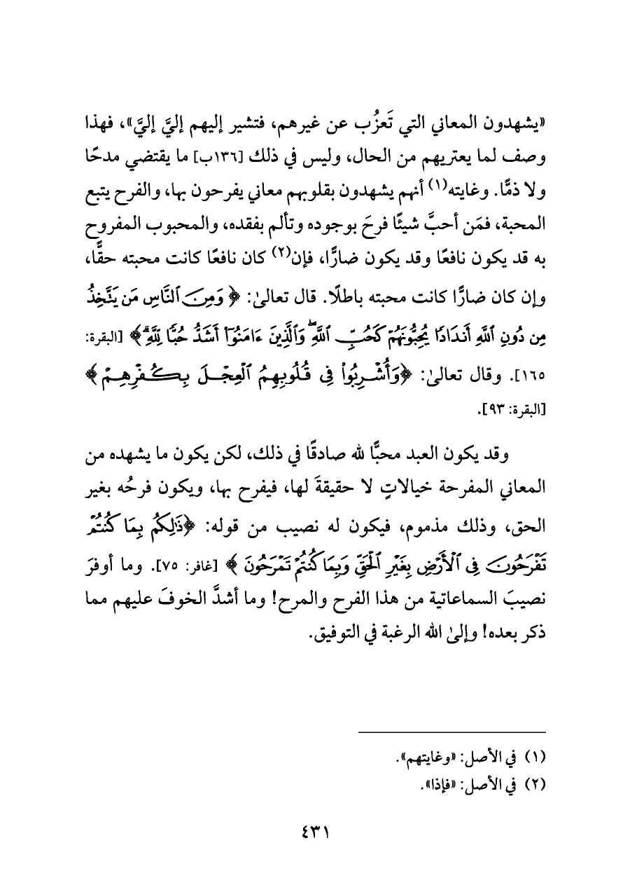 وقد يكون العبد محبًّا لله صادقًا في ذلك، لكن يكون ما يشهده من المعاني المفرحة خيالاتٍ لا حقيقةَ لها، فيفرح بها، ويكون فرحُه بغير الحق، وذلك مذموم، فيكون له نصيب من قوله: {ذَلِكُمْ بِمَا كُنْتُمْ تَفْرَحُونَ فِي الْأَرْضِ بِغَيْرِ الْحَقِّ وَبِمَا كُنْتُمْ تَمْرَحُونَ} [غافر: ٧٥]. وما أوفرَ نصيبَ السماعاتية من هذا الفرح والمرح! وما أشدَّ الخوفَ عليهم مما ذكر بعده! وإلى الله الرغبة في التوفيق.