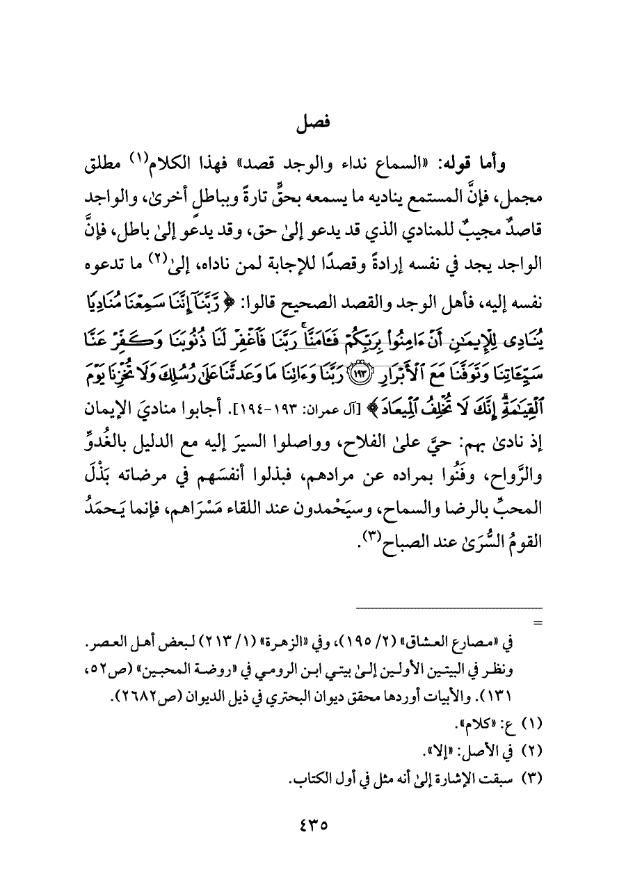 وأما قوله: "السماع نداء والوجد قصد" فهذا الكلام (¬١) مطلق مجمل، فإنَّ المستمع يناديه ما يسمعه بحقٍّ تارةً وبباطلٍ أخرى، والواجد قاصدٌ مجيبٌ للمنادي الذي قد يدعو إلى حق، وقد يدعو إلى باطل، فإنَّ الواجد يجد في نفسه إرادةً وقصدًا للإجابة لمن ناداه، إلى (¬٢) ما تدعوه نفسه إليه، فأهل الوجد والقصد الصحيح قالوا: {رَبَّنَا إِنَّنَا سَمِعْنَا مُنَادِيًا يُنَادِي لِلْإِيمَانِ أَنْ آمِنُوا بِرَبِّكُمْ فَآمَنَّا رَبَّنَا فَاغْفِرْ لَنَا ذُنُوبَنَا وَكَفِّرْ عَنَّا سَيِّئَاتِنَا وَتَوَفَّنَا مَعَ الْأَبْرَارِ (١٩٣) رَبَّنَا وَآتِنَا مَا وَعَدْتَنَا عَلَى رُسُلِكَ وَلَا تُخْزِنَا يَوْمَ الْقِيَامَةِ إِنَّكَ لَا تُخْلِفُ الْمِيعَادَ} [آل عمران: ١٩٣ - ١٩٤]. أجابوا مناديَ الإيمان إذ نادى بهم: حيَّ على الفلاح، وواصلوا السيرَ إليه مع الدليل بالغُدوِّ والرَّواح، وفَنُوا بمراده عن مرادهم، فبذلوا أنفسَهم في مرضاته بَذْلَ المحبِّ بالرضا والسماح، وسيَحْمدون عند اللقاء مَسْرَاهم، فإنما يَحمَدُ القومُ السُّرَى عند الصباح (¬٣).