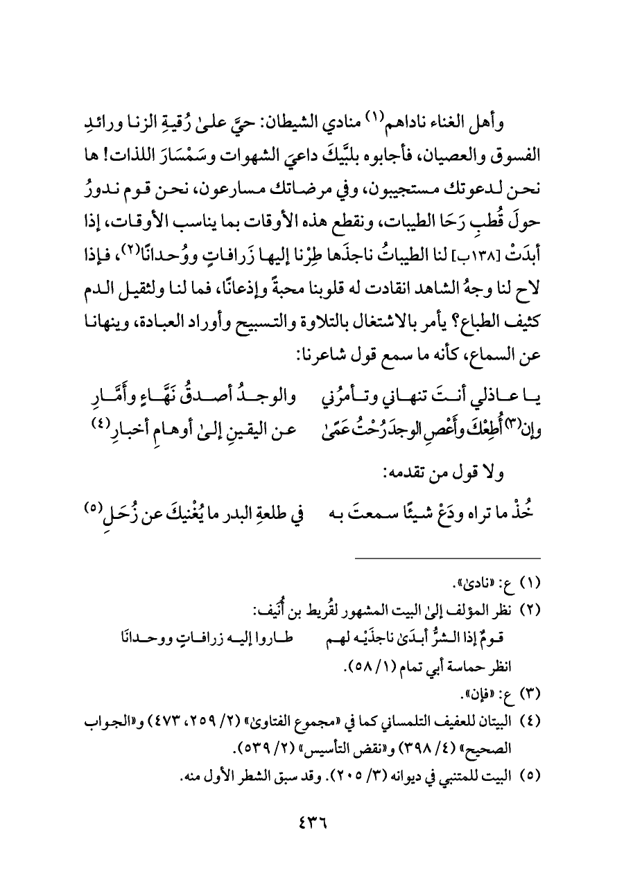 وأهل الغناء ناداهم (¬١) منادي الشيطان: حيَّ على رُقيةِ الزنا ورائدِ الفسوق والعصيان، فأجابوه بلبَّيكَ داعيَ الشهوات وسَمْسَارَ اللذات! ها نحن لدعوتك مستجيبون، وفي مرضاتك مسارعون، نحن قوم ندورُ حولَ قُطبِ رَحَا الطيبات، ونقطع هذه الأوقات بما يناسب الأوقات، إذا أبدَتْ [١٣٨ ب] لنا الطيباتُ ناجذَها طِرْنا إليها زَرافاتٍ ووُحدانًا (¬٢)،