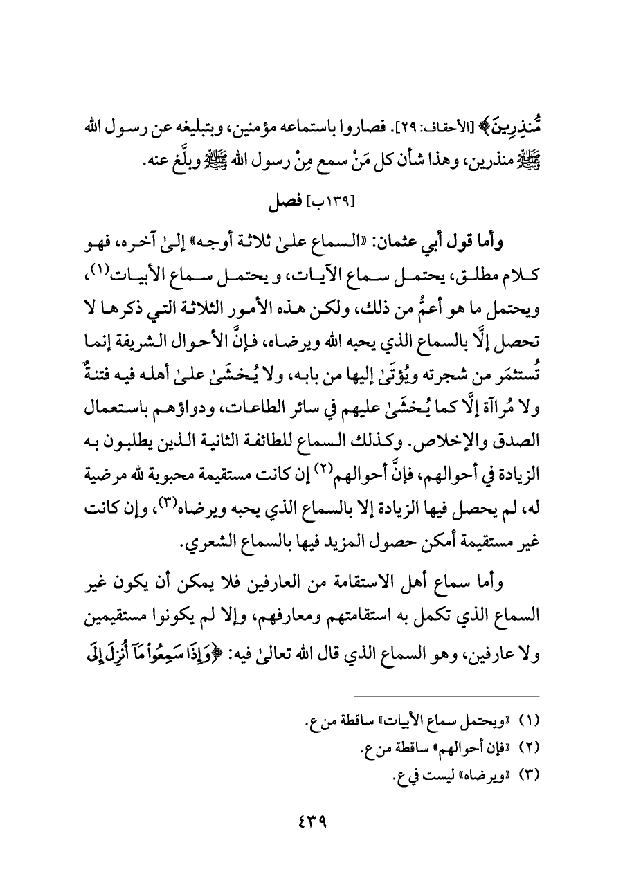 وأما سماع أهل الاستقامة من العارفين فلا يمكن أن يكون غير السماع الذي تكمل به استقامتهم ومعارفهم، وإلا لم يكونوا مستقيمين ولا عارفين، وهو السماع الذي قال الله تعالى فيه: {وَإِذَا سَمِعُوا مَا أُنْزِلَ إِلَى