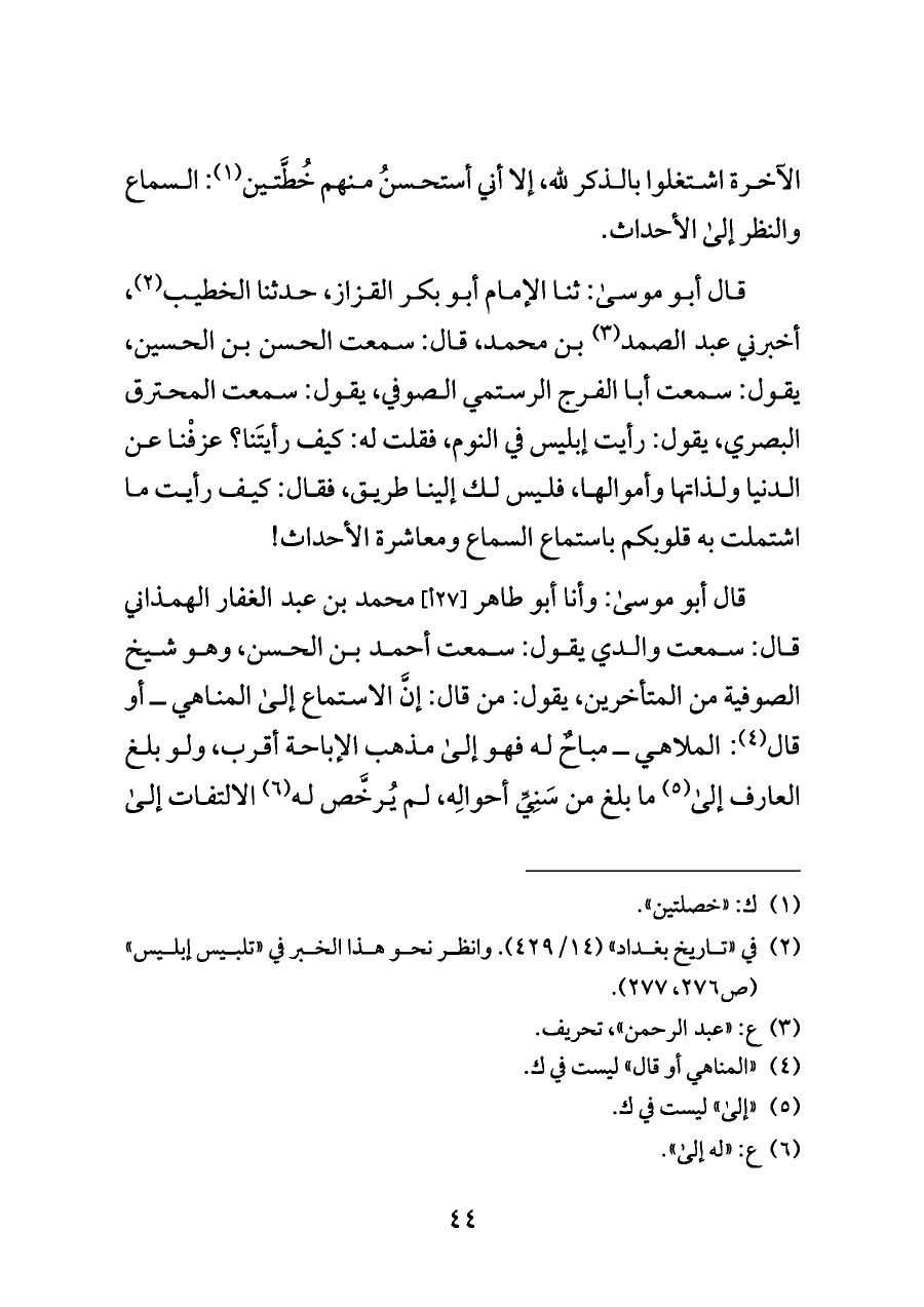 قال أبو موسى: وأنا أبو طاهر [٢٧ أ] محمد بن عبد الغفار الهمذاني قال: سمعت والدي يقول: سمعت أحمد بن الحسن، وهو شيخ الصوفية من المتأخرين، يقول: من قال: إنَّ الاستماع إلى المناهي ــ أو قال (¬٤): الملاهي ــ مباحٌ له فهو إلى مذهب الإباحة أقرب، ولو بلغ العارف إلى (¬٥) ما بلغ من سَنِيِّ أحوالِه، لم يُرخَّص له (¬٦) الالتفات إلى