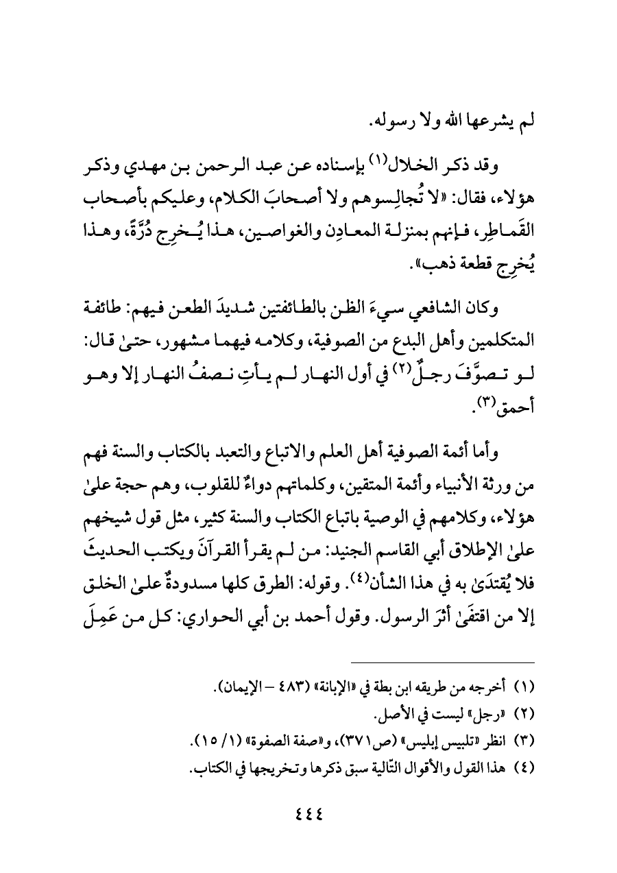وقد ذكر الخلال (¬١) بإسناده عن عبد الرحمن بن مهدي وذكر هؤلاء، فقال: "لا تُجالِسوهم ولا أصحابَ الكلام، وعليكم بأصحاب القَماطِر، فإنهم بمنزلة المعادِن والغواصين، هذا يُخرِج دُرَّةً، وهذا يُخرِج قطعة ذهب".