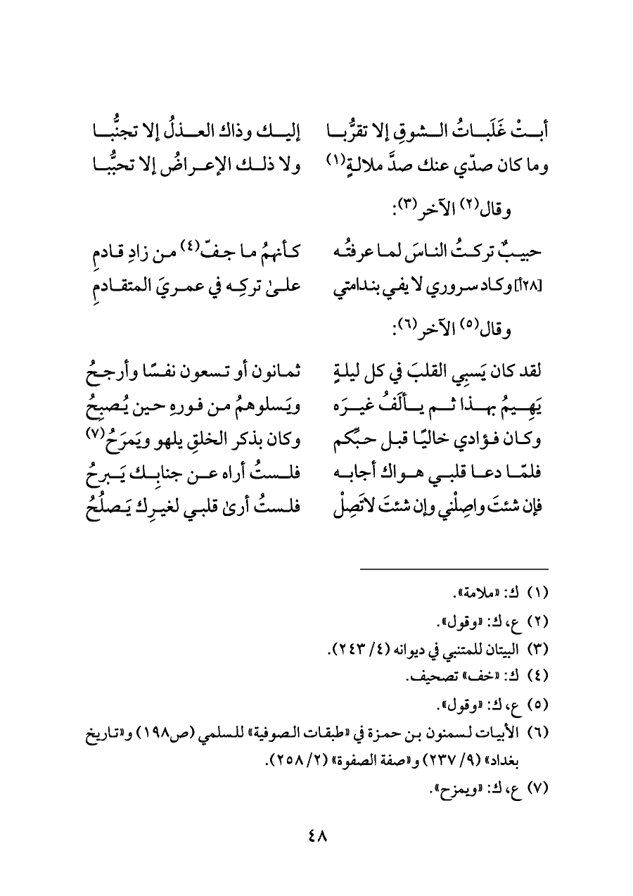 (¬٦) الأبيات لسمنون بن حمزة في "طبقات الصوفية" للسلمي (ص ١٩٨) و"تاريخ بغداد" (٩/ ٢٣٧) و"صفة الصفوة" (٢/ ٢٥٨).