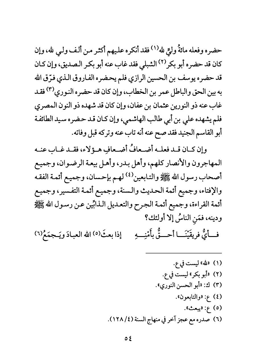 حضره وفعله مائةُ وليٍّ لله (¬١) فقد أنكره عليهم أكثر من ألف ولي لله، وإن كان قد حضره أبو بكر (¬٢) الشبلي فقد غاب عنه أبو بكر الصديق، وإن كان قد حضره يوسف بن الحسين الرازي فلم يحضره الفاروق الذي فرّق الله به بين الحق والباطل عمر بن الخطاب، وإن كان قد حضره النوري (¬٣) فقد غاب عنه ذو النورين عثمان بن عفان، وإن كان قد شهده ذو النون المصري فلم يشهده علي بن أبي طالب الهاشمي، وإن كان قد حضره سيد الطائفة أبو القاسم الجنيد فقد صح عنه أنه تاب عنه وتركه قبل وفاته.