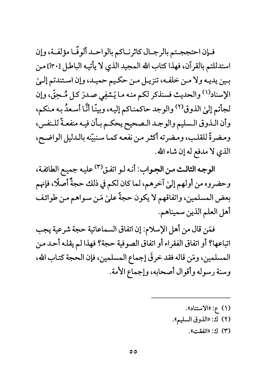 الوجه الثالث من الجواب: أنه لو اتفق (¬٣) عليه جميع الطائفة، وحضروه من أولهم إلى آخرهم، لما كان لكم في ذلك حجةٌ أصلًا، فإنهم بعض المسلمين، واتفاقهم لا يكون حجةً على مَن سواهم من طوائف أهل العلم الذين سميناهم.