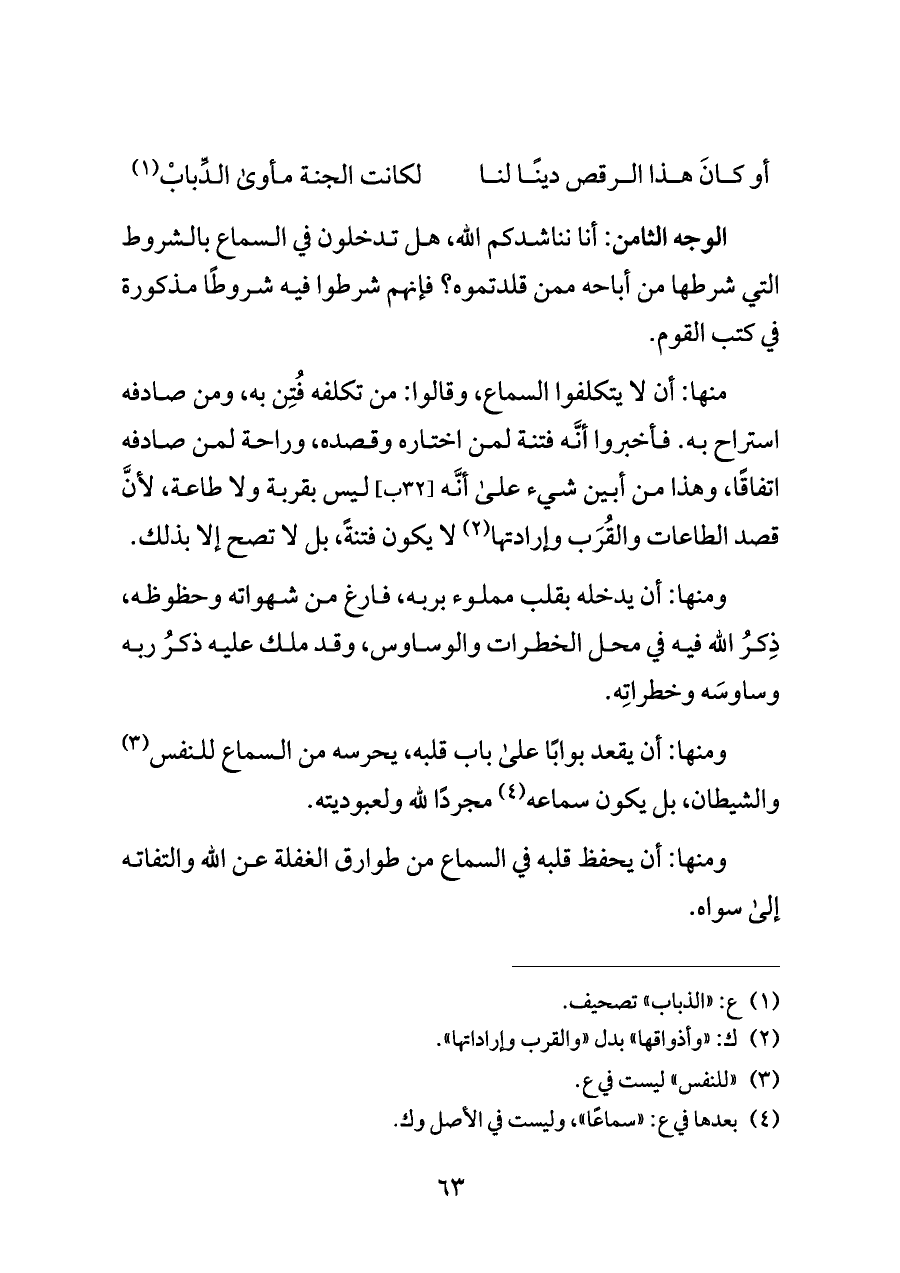 الوجه الثامن: أنا نناشدكم الله، هل تدخلون في السماع بالشروط التي شرطها من أباحه ممن قلدتموه؟ فإنهم شرطوا فيه شروطًا مذكورة في كتب القوم.