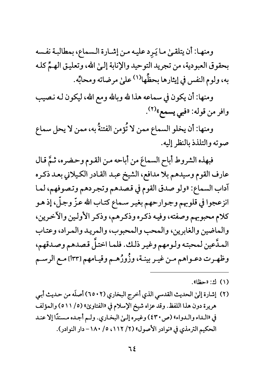 فبهذه الشروط أباح السماعَ من أباحه من القوم وحضره، ثمَّ قال عارف القوم وسيدهم بلا مدافع، الشيخ عبد القادر الكيلاني بعد ذكره آداب السماع: "ولو صدق القوم في قصدهم وتجردهم وتصوفهم، لما انزعجوا في قلوبهم وجوارحهم بغير سماع كتاب الله عزّ وجلّ، إذ هو كلام محبوبهم وصفته، وفيه ذكره وذكرهم، وذكر الأولين والآخرين، والماضين والغابرين، والمحب والمحبوب، والمريد والمراد، وعتاب المدَّعين لمحبته ولومهم وغير ذلك. فلما اختلَّ قصدهم وصدقهم، وظهرت دعواهم من غير بينة، وزُورُهم وقيامهم [٣٣ أ] مع الرسم