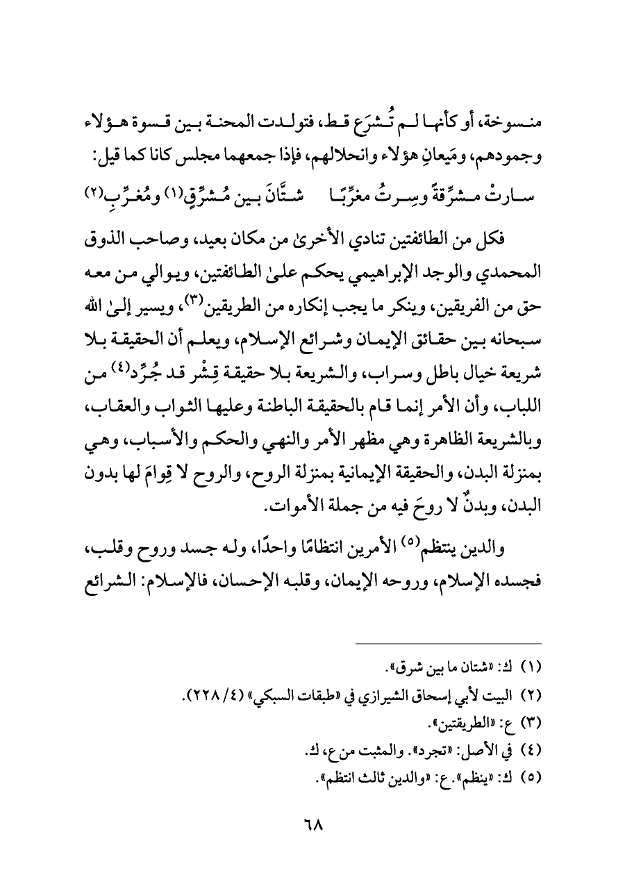 فكل من الطائفتين تنادي الأخرى من مكان بعيد، وصاحب الذوق المحمدي والوجد الإبراهيمي يحكم على الطائفتين، ويوالي من معه حق من الفريقين، وينكر ما يجب إنكاره من الطريقين (¬٣)، ويسير إلى الله سبحانه بين حقائق الإيمان وشرائع الإسلام، ويعلم أن الحقيقة بلا شريعة خيال باطل وسراب، والشريعة بلا حقيقة قِشْر قد جُرِّد (¬٤) من اللباب، وأن الأمر إنما قام بالحقيقة الباطنة وعليها الثواب والعقاب، وبالشريعة الظاهرة وهي مظهر الأمر والنهي والحكم والأسباب، وهي بمنزلة البدن، والحقيقة الإيمانية بمنزلة الروح، والروح لا قِوامَ لها بدون البدن، وبدنٌ لا روحَ فيه من جملة الأموات.