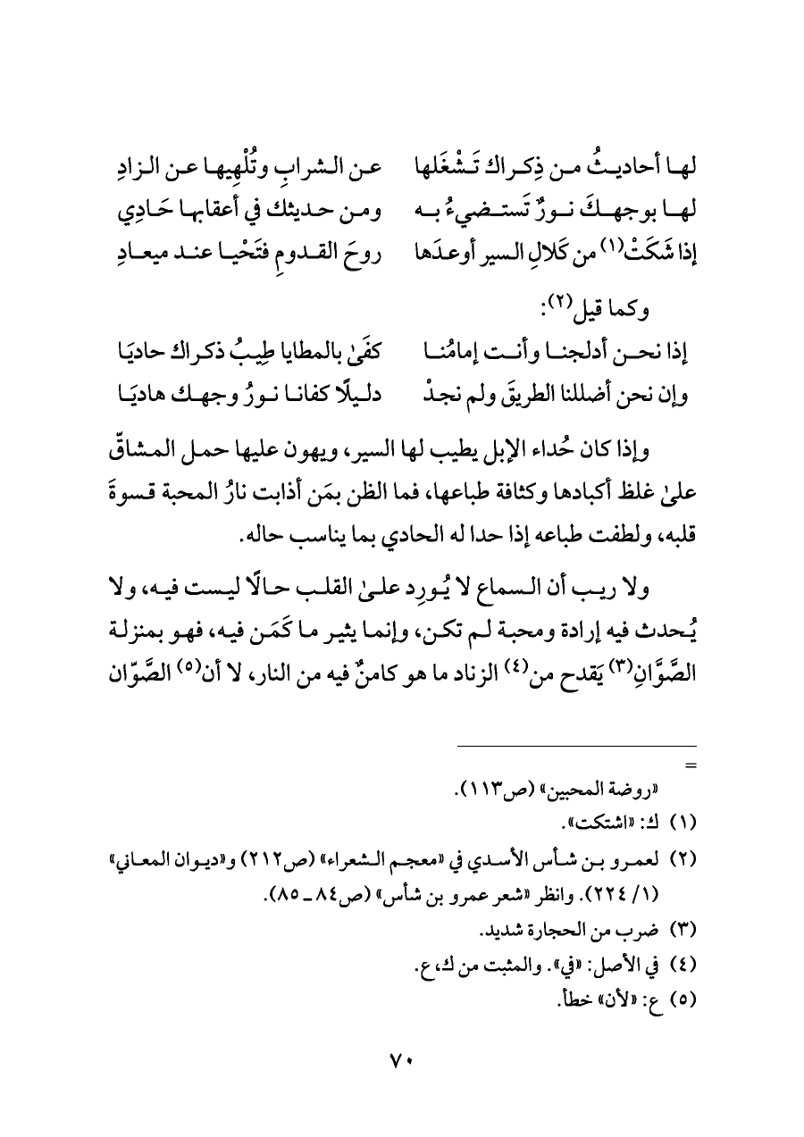وإذا كان حُداء الإبل يطيب لها السير، ويهون عليها حمل المشاقّ على غلظ أكبادها وكثافة طباعها، فما الظن بمَن أذابت نارُ المحبة قسوةَ قلبه، ولطفت طباعه إذا حدا له الحادي بما يناسب حاله.