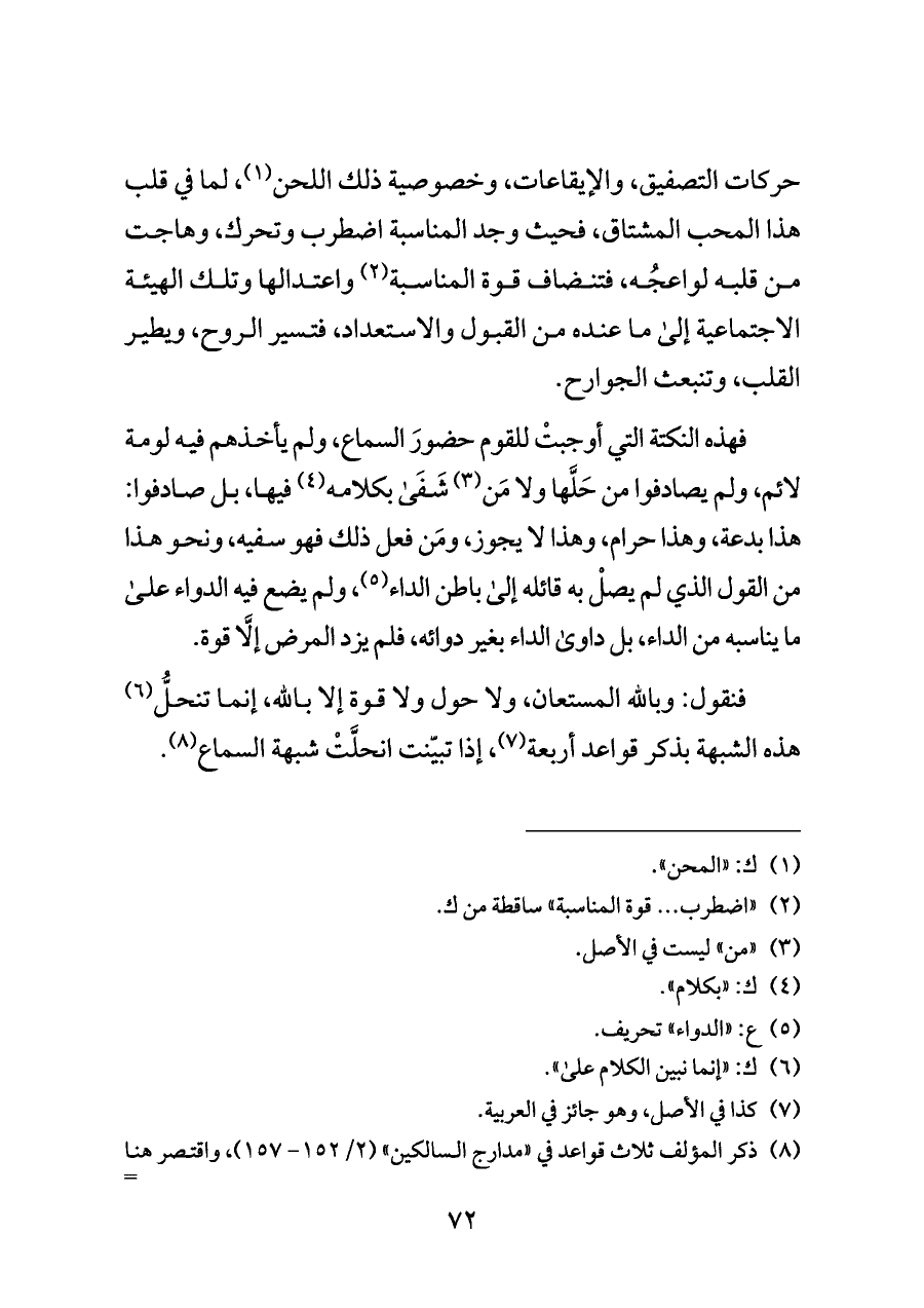 فهذه النكتة التي أوجبتْ للقوم حضورَ السماع، ولم يأخذهم فيه لومة لائم، ولم يصادفوا من حَلَّها ولا مَن (¬٣) شَفَى بكلامه (¬٤) فيها، بل صادفوا: هذا بدعة، وهذا حرام، وهذا لا يجوز، ومَن فعل ذلك فهو سفيه، ونحو هذا من القول الذي لم يصلْ به قائله إلى باطن الداء (¬٥)، ولم يضع فيه الدواء على ما يناسبه من الداء، بل داوى الداء بغير دوائه، فلم يزد المرض إلَّا قوة.