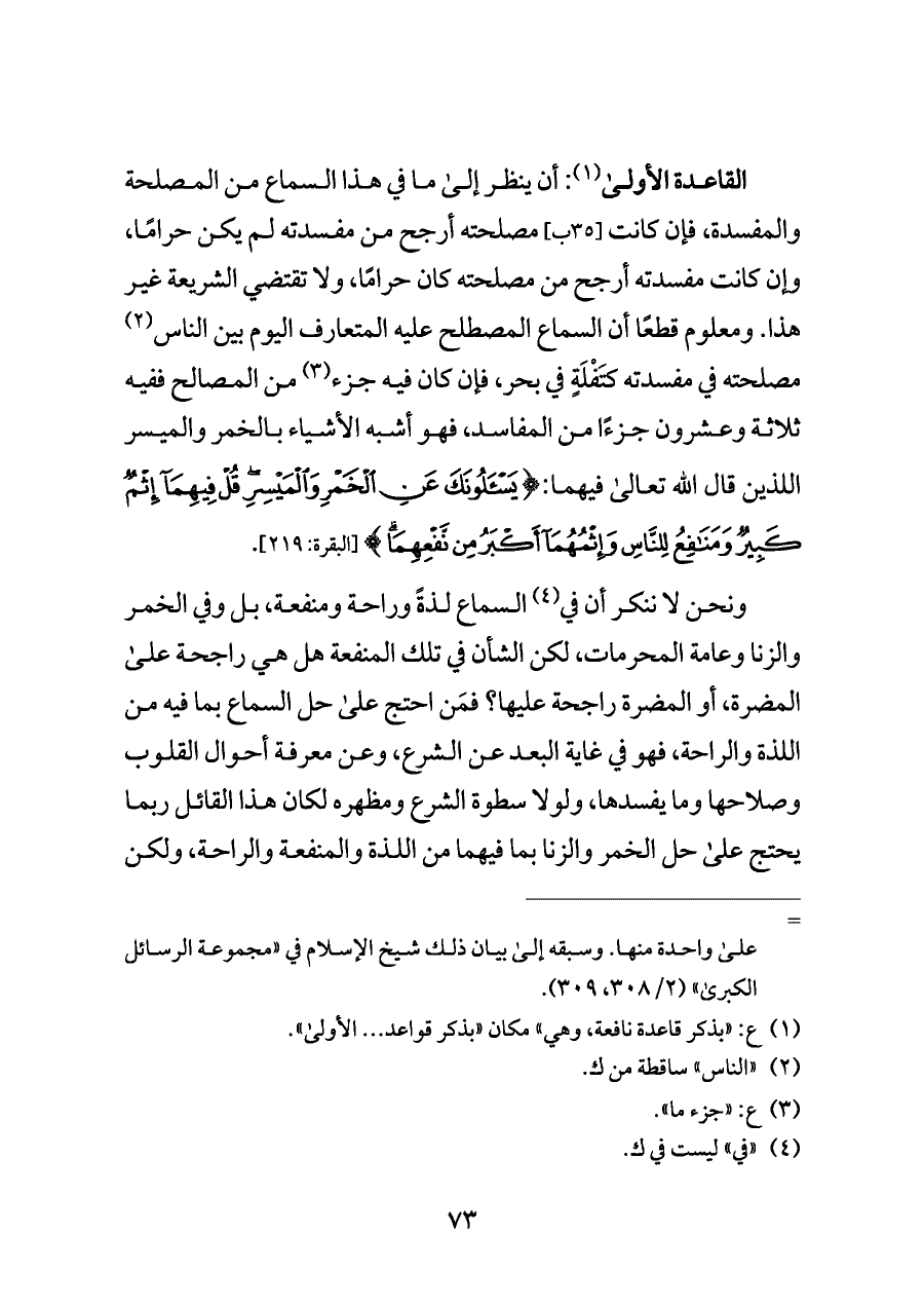 القاعدة الأولى (¬١): أن ينظر إلى ما في هذا السماع من المصلحة والمفسدة، فإن كانت [٣٥ ب] مصلحته أرجح من مفسدته لم يكن حرامًا، وإن كانت مفسدته أرجح من مصلحته كان حرامًا، ولا تقتضي الشريعة غير هذا. ومعلوم قطعًا أن السماع المصطلح عليه المتعارف اليوم بين الناس (¬٢) مصلحته في مفسدته كتَفْلَةٍ في بحر، فإن كان فيه جزء (¬٣) من المصالح ففيه ثلاثة وعشرون جزءًا من المفاسد، فهو أشبه الأشياء بالخمر والميسر اللذين قال الله تعالى فيهما: {يَسْأَلُونَكَ عَنِ الْخَمْرِ وَالْمَيْسِرِ قُلْ فِيهِمَا إِثْمٌ كَبِيرٌ وَمَنَافِعُ لِلنَّاسِ وَإِثْمُهُمَا أَكْبَرُ مِنْ نَفْعِهِمَا} [البقرة: ٢١٩].