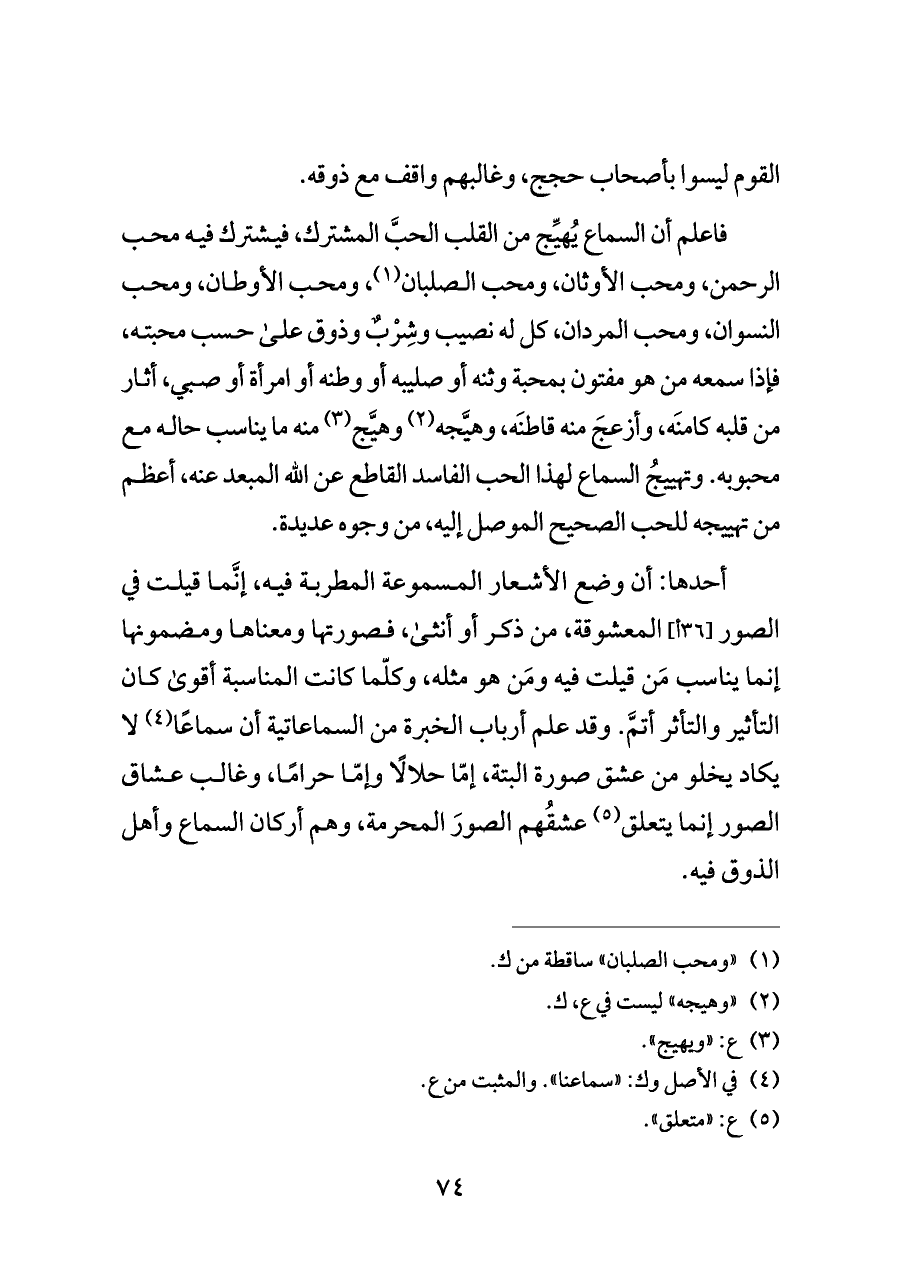 أحدها: أن وضع الأشعار المسموعة المطربة فيه، إنَّما قيلت في الصور [٣٦ أ] المعشوقة، من ذكر أو أنثى، فصورتها ومعناها ومضمونها إنما يناسب مَن قيلت فيه ومَن هو مثله، وكلّما كانت المناسبة أقوى كان التأثير والتأثر أتمَّ. وقد علم أرباب الخبرة من السماعاتية أن سماعًا (¬٤) لا يكاد يخلو من عشق صورة البتة، إمّا حلالًا وإمّا حرامًا، وغالب عشاق الصور إنما يتعلق (¬٥) عشقُهم الصورَ المحرمة، وهم أركان السماع وأهل الذوق فيه.