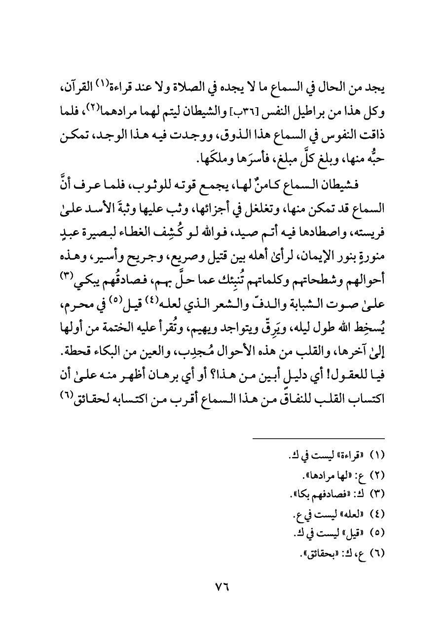 يجد من الحال في السماع ما لا يجده في الصلاة ولا عند قراءة (¬١) القرآن، وكل هذا من براطيل النفس [٣٦ ب] والشيطان ليتم لهما مرادهما (¬٢)، فلما ذاقت النفوس في السماع هذا الذوق، ووجدت فيه هذا الوجد، تمكن حبُّه منها، وبلغ كلَّ مبلغ، فأسرَها وملكَها.