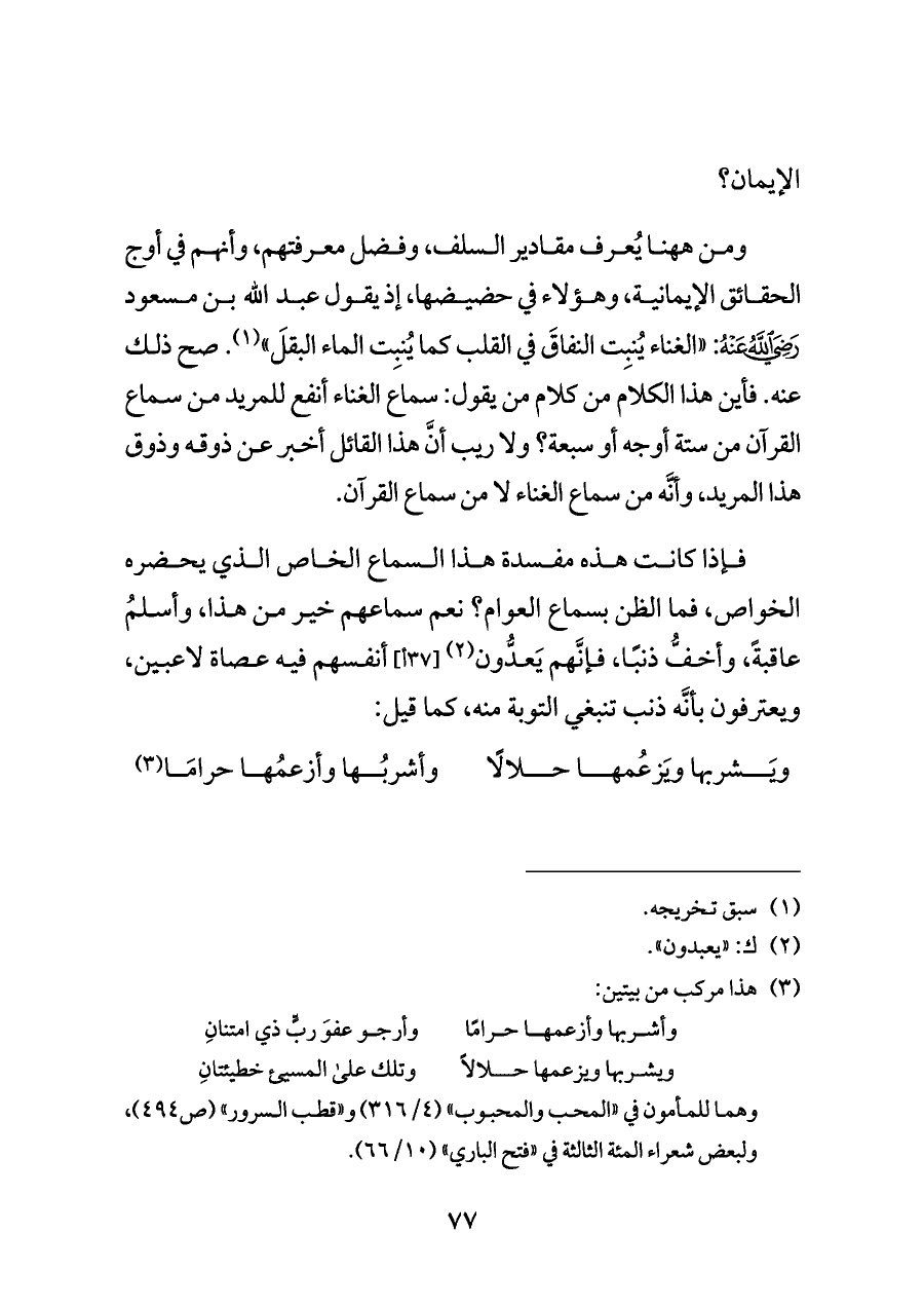 ومن ههنا يُعرف مقادير السلف، وفضل معرفتهم، وأنهم في أوج الحقائق الإيمانية، وهؤلاء في حضيضها، إذ يقول عبد الله بن مسعود - رضي الله عنه -: "الغناء يُنبِت النفاقَ في القلب كما يُنبِت الماء البقلَ" (¬١). صح ذلك عنه. فأين هذا الكلام من كلام من يقول: سماع الغناء أنفع للمريد من سماع القرآن من ستة أوجه أو سبعة؟ ولا ريب أنَّ هذا القائل أخبر عن ذوقه وذوق هذا المريد، وأنَّه من سماع الغناء لا من سماع القرآن.