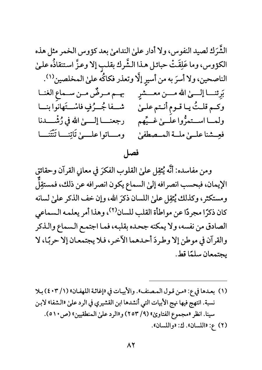 ومن مفاسده: أنَّه يُثقِل على القلوب الفكرَ في معاني القرآن وحقائق الإيمان، فبحسب انصرافه إلى السماع يكون انصرافه عن ذلك، فمستقِلٌّ ومستكثر، وكذلك يُثقِل على اللسان ذكرَ الله، وإن خف الذكر على لسانه كان ذكرًا مجردًا عن مواطأة القلب للسان (¬٢)، وهذا أمر يعلمه السماعي الصادق من نفسه، ولا يمكنه جحده بقلبه، فما اجتمع السماع والذكر والقرآن في موطن إلا وطردَ أحدهما الآخر، فلا يجتمعان إلا حربًا، لا يجتمعان سلمًا قط.