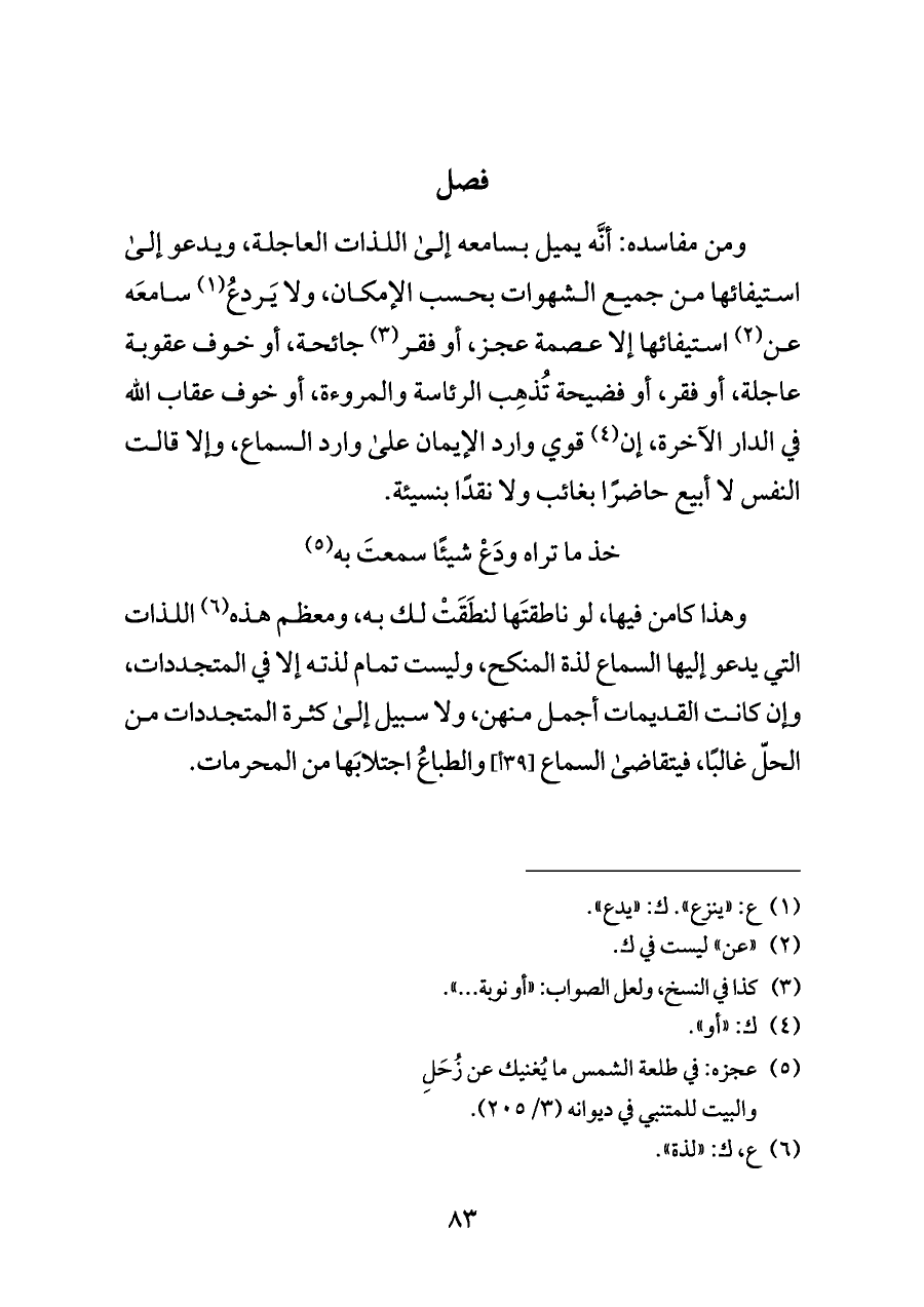 ومن مفاسده: أنَّه يميل بسامعه إلى اللذات العاجلة، ويدعو إلى استيفائها من جميع الشهوات بحسب الإمكان، ولا يَردعُ (¬١) سامعَه عن (¬٢) استيفائها إلا عصمة عجز، أو فقر (¬٣) جائحة، أو خوف عقوبة عاجلة، أو فقر، أو فضيحة تُذهِب الرئاسة والمروءة، أو خوف عقاب الله في الدار الآخرة، إن (¬٤) قوي وارد الإيمان على وارد السماع، وإلا قالت النفس لا أبيع حاضرًا بغائب ولا نقدًا بنسيئة.