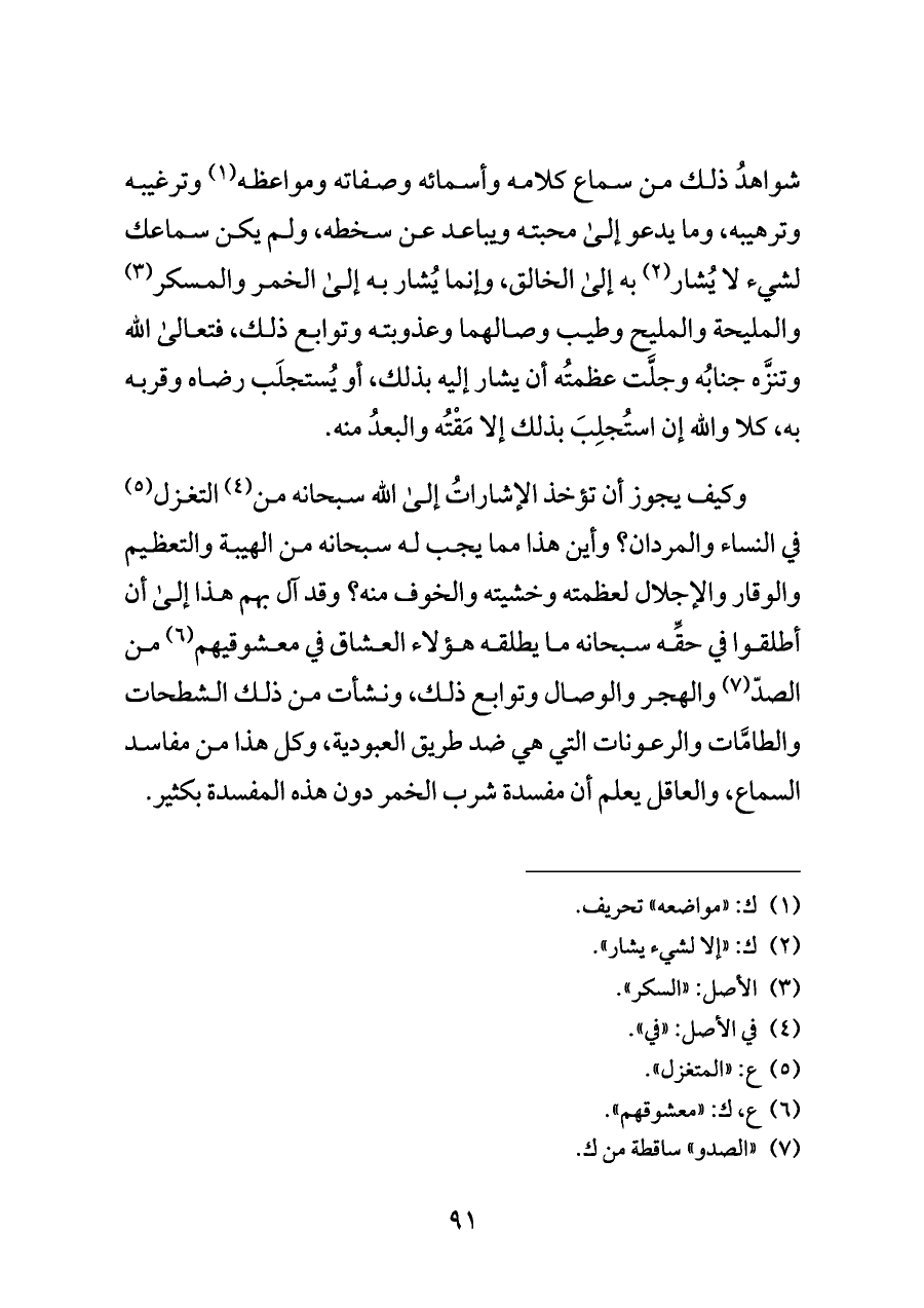 شواهدُ ذلك من سماع كلامه وأسمائه وصفاته ومواعظه (¬١) وترغيبه وترهيبه، وما يدعو إلى محبته ويباعد عن سخطه، ولم يكن سماعك لشيء لا يُشار (¬٢) به إلى الخالق، وإنما يُشار به إلى الخمر والمسكر (¬٣) والمليحة والمليح وطيب وصالهما وعذوبته وتوابع ذلك، فتعالى الله وتنزَّه جنابُه وجلَّت عظمتُه أن يشار إليه بذلك، أو يُستجلَب رضاه وقربه به، كلا والله إن استُجلِبَ بذلك إلا مَقْتُه والبعدُ منه.