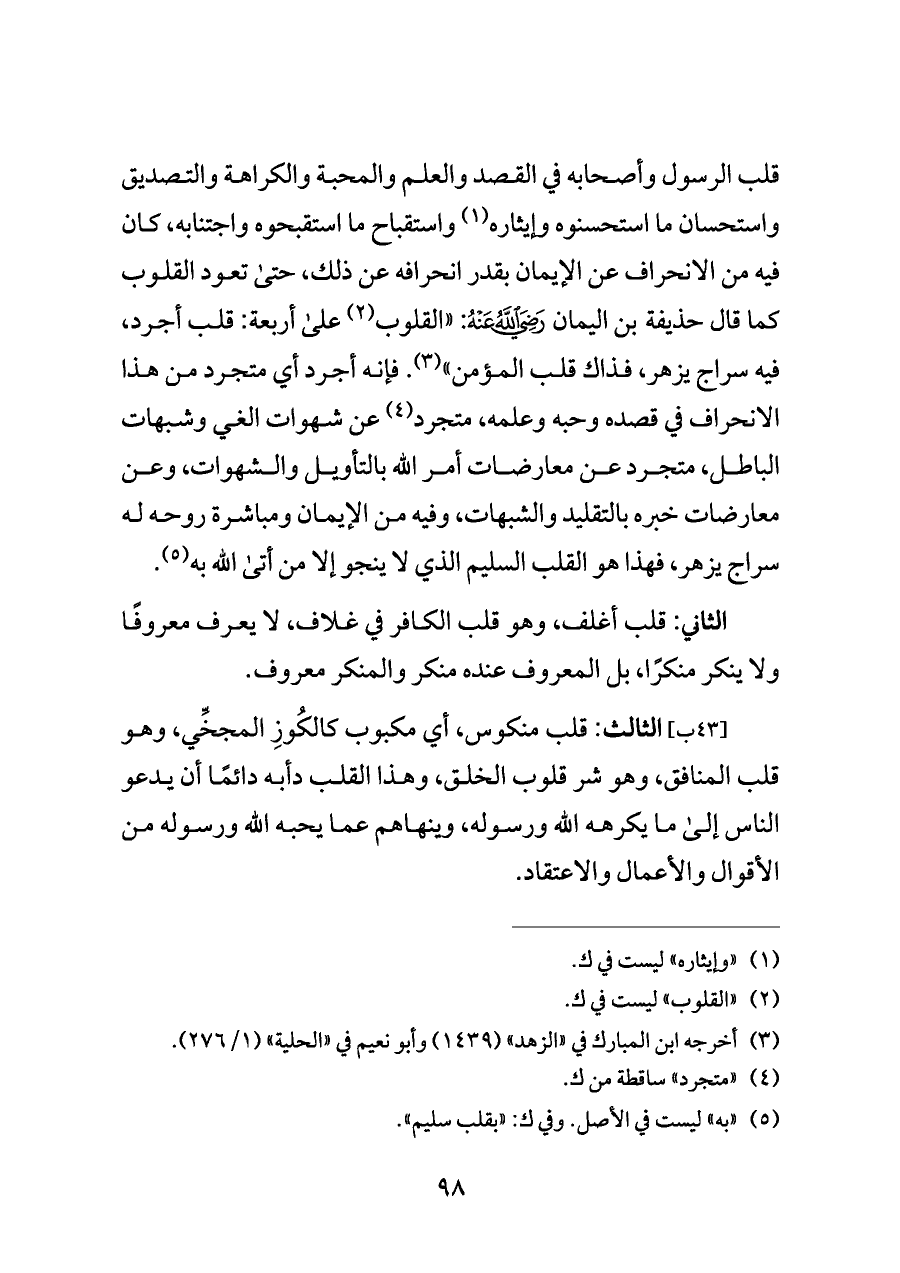 [٤٣ ب] الثالث: قلب منكوس، أي مكبوب كالكُوزِ المجخِّي، وهو قلب المنافق، وهو شر قلوب الخلق، وهذا القلب دأبه دائمًا أن يدعو الناس إلى ما يكرهه الله ورسوله، وينهاهم عما يحبه الله ورسوله من الأقوال والأعمال والاعتقاد.
