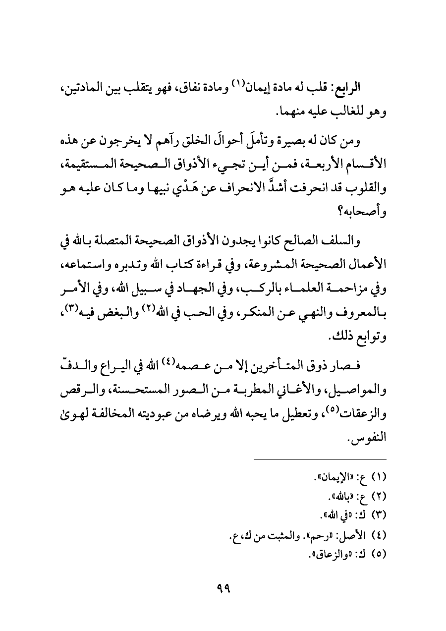ومن كان له بصيرة وتأملَ أحوالَ الخلق رآهم لا يخرجون عن هذه الأقسام الأربعة، فمن أين تجيء الأذواق الصحيحة المستقيمة، والقلوب قد انحرفت أشدَّ الانحراف عن هَدْي نبيها وما كان عليه هو وأصحابه؟