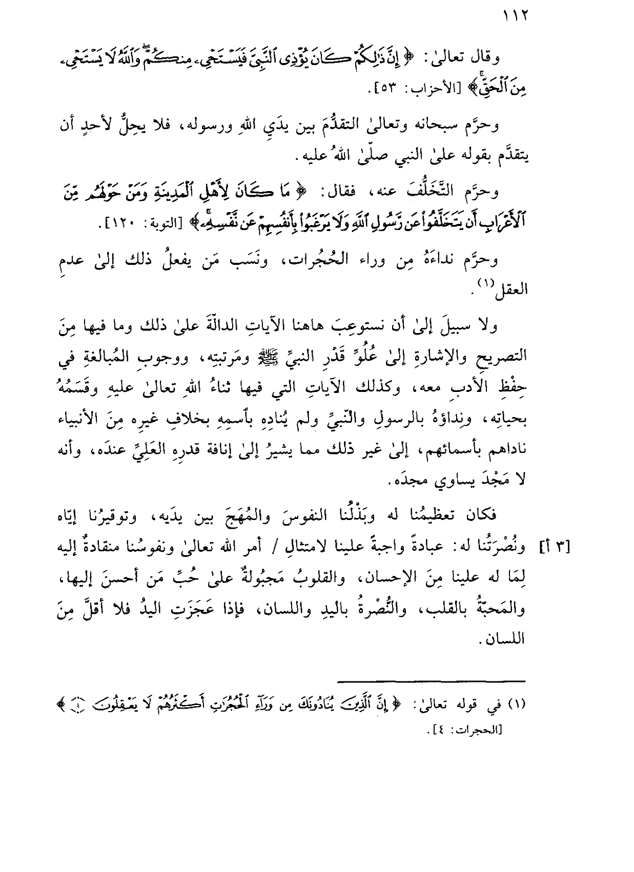 وحرم سبحانه وتعالى التقدم بين يدي الله ورسوله، فلا يحل لأحد أن يتقدم بقوله على النبي صلى الله عليه.