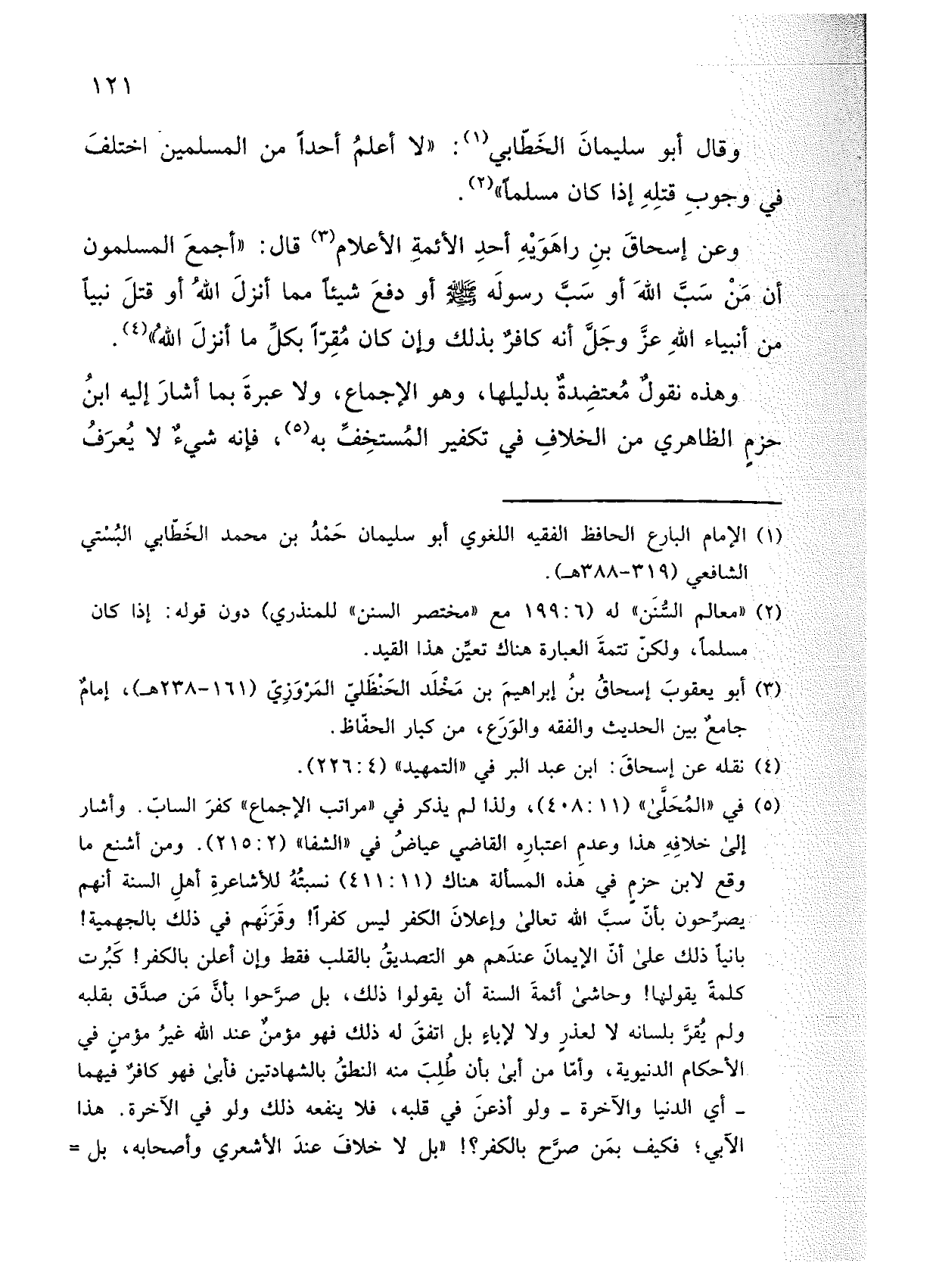 وعن إسحاق بن راهويه أحد الأئمة الأعلام قال: "أجمع المسلمون أن من سبَّ الله أو سبَّ رسوله صلى الله عليه وسلم أو دفع شيئًا مما أنزل الله أو قتل نبيًا من أنبياء الله عز وجل أنه كافر بذلك وإن كان مقرًا بكل ما أنزل الله".