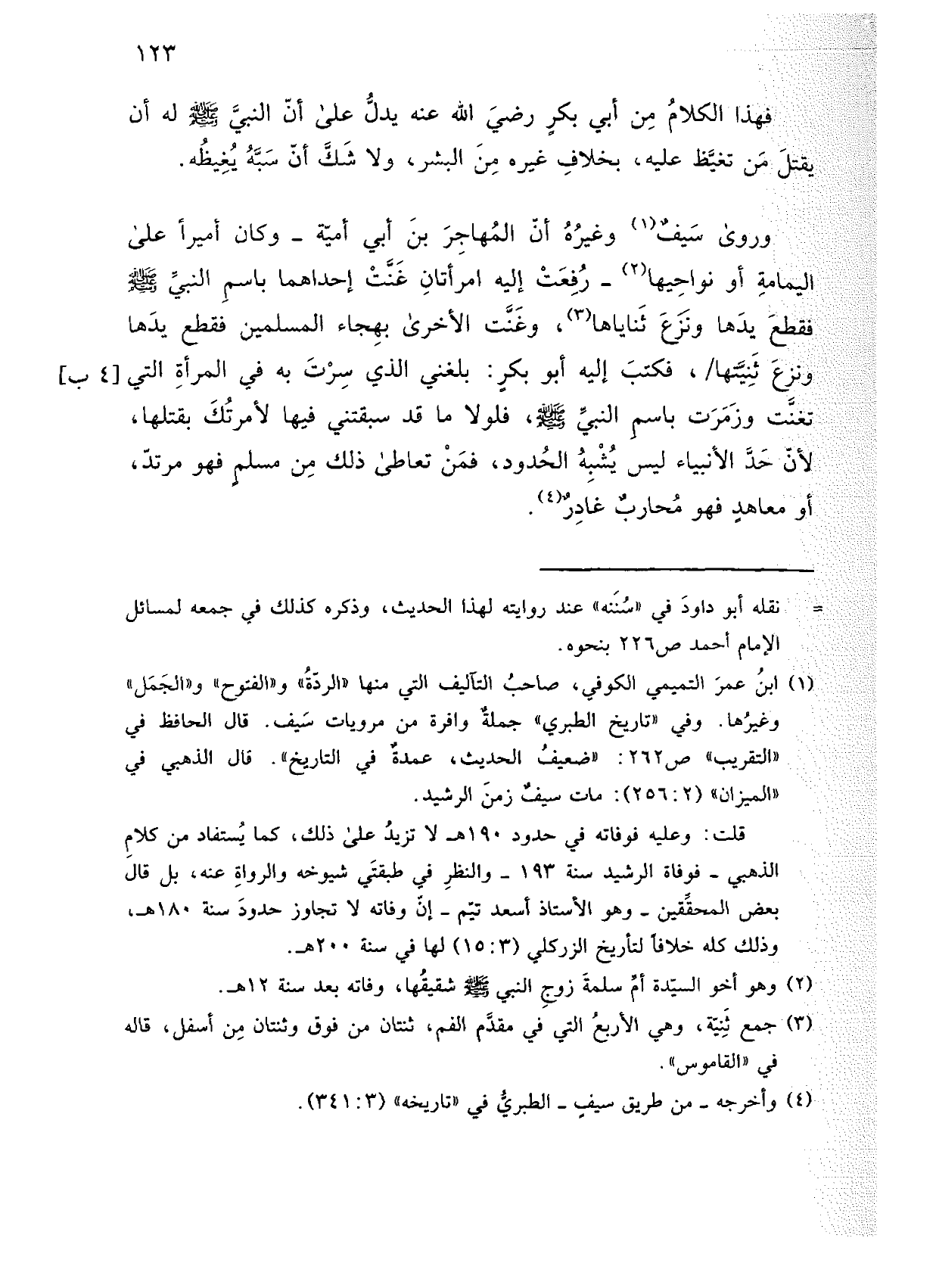 وروى سيف وغيره أن المهاجر بن أبي أمية ـ وكان أميرًا على اليمامة أو نواحيها ـ رفعت إليه امرأتان غنت إحداهما باسم النبي صلى الله عليه وسلم فقطع يدها ونزع ثناياها، وغنت الأخرى بهجاء المسلمين فقطع يدها ونزع ثنيتها/، فكتب إليه أبو بكر: بلغني الذي سرت به في المرأة التي تغنت وزمرت باسم النبي صلى الله عليه وسلم، فلولا ما قد سبقتني فيها لأمرتك بقلتها، لأن حد الأنبياء ليس يشبه الحدود، فمن تعاطى ذلك من مسلم فهو مرتد، أو معاهد فهو محارب غادر.
