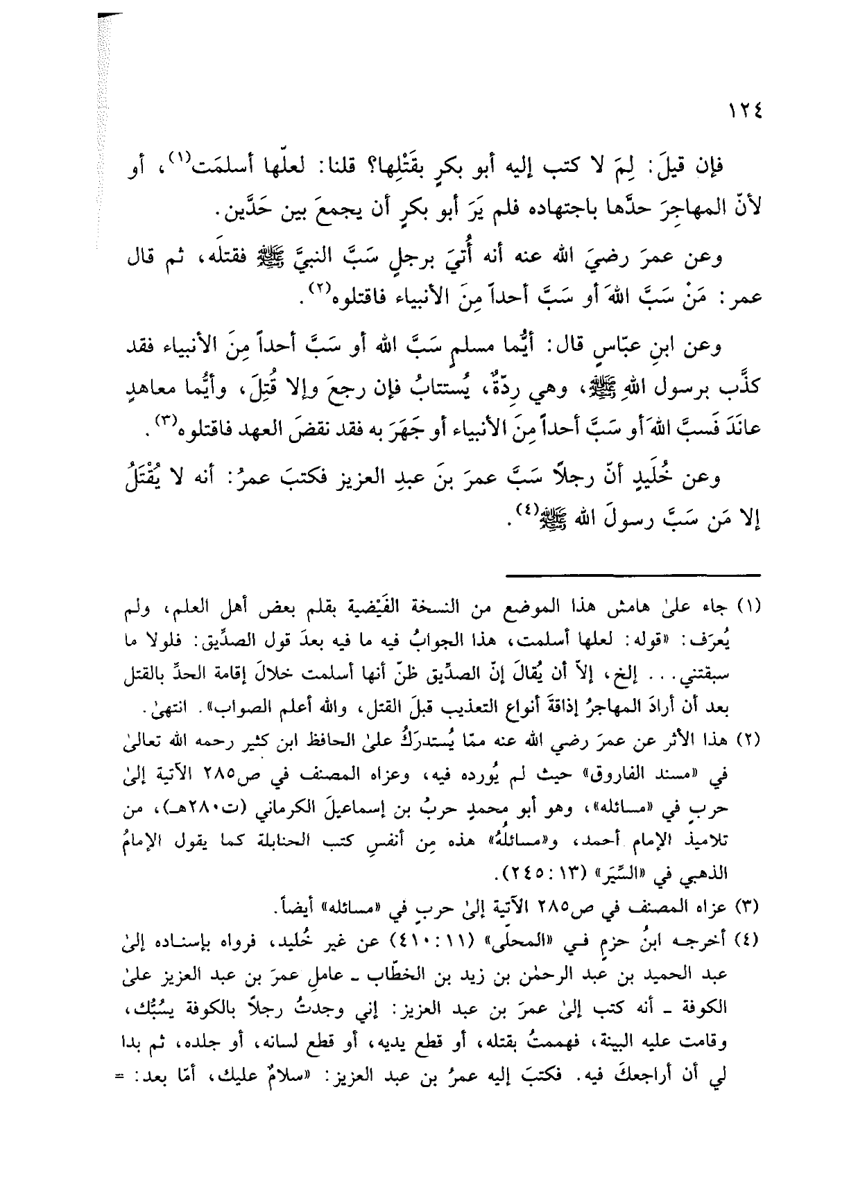 وعن خليد أن رجلاً سب عمر بن عبد العزيز فكتب عمر: أنه لا يقتل إلا من سب رسول الله صلى الله عليه وسلم.