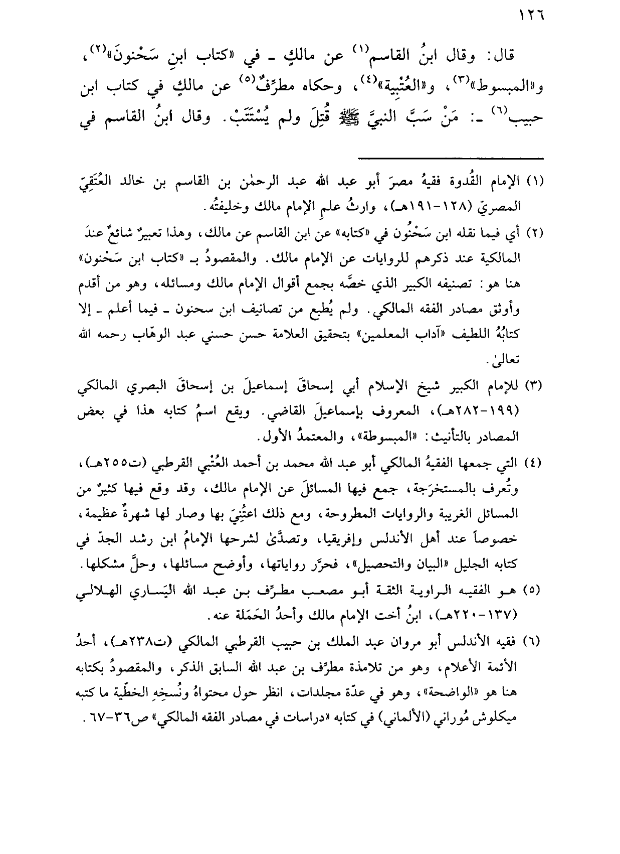 قال: وقال ابن القاسم عن مالك ـ في "كتاب ابن سحنون"، و"المبسوط"، و"العتبية"، وحكاه مطرف عن مالك في كتاب ابن حبيب ـ: من سب النبي صلى الله عليه وسلم قتل ولم يستتب. وقال ابن القاسم في
