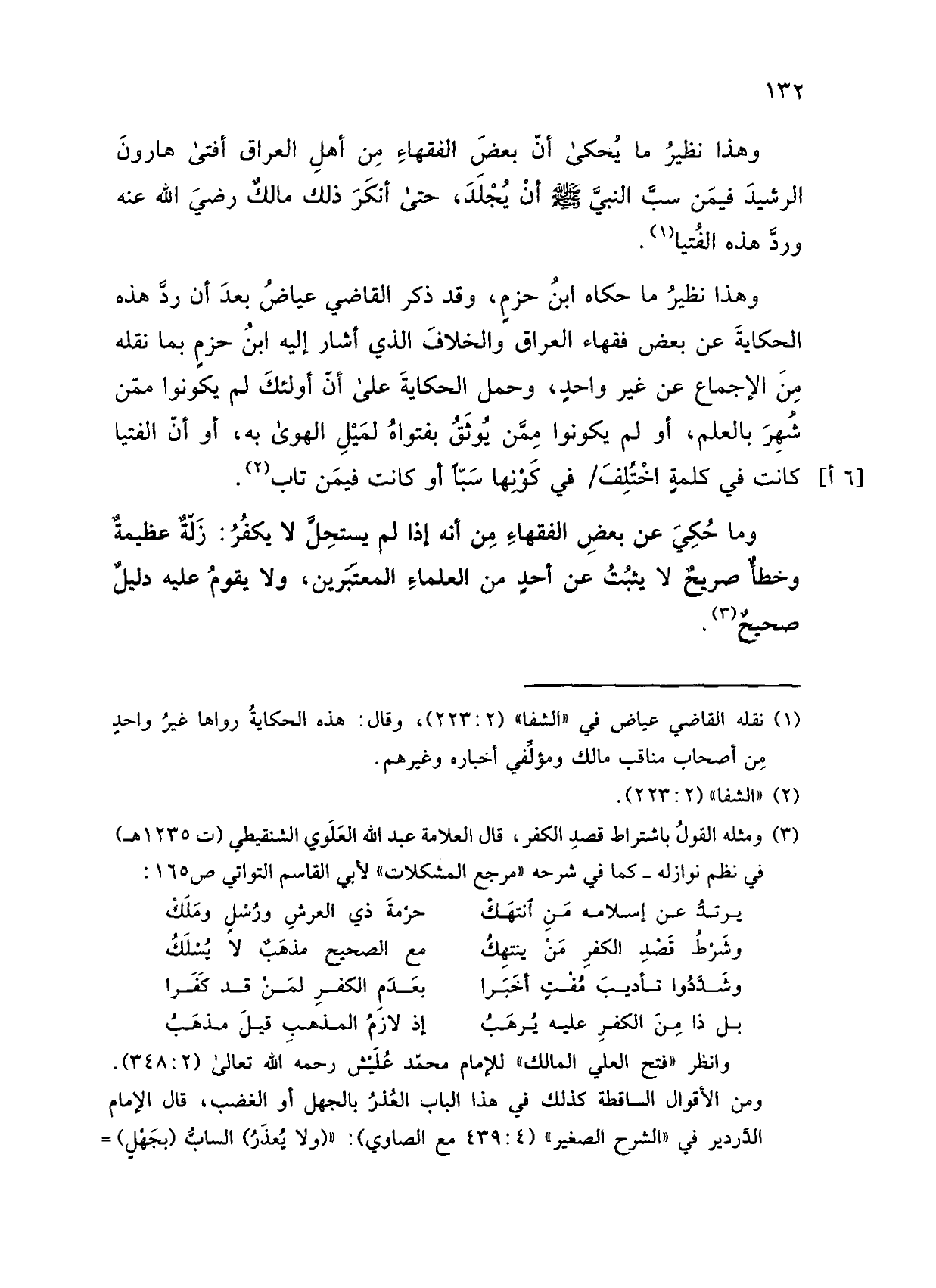 وهذا نظير ما يُحكى أن بعض الفقهاء من أهل العراق أفتى هارون الرشيد فيمن سب النبي صلى الله عليه وسلم أن يجلدا، حتى أنكر ذلك مالك رضي الله عنه ورد هذه الفتيا.