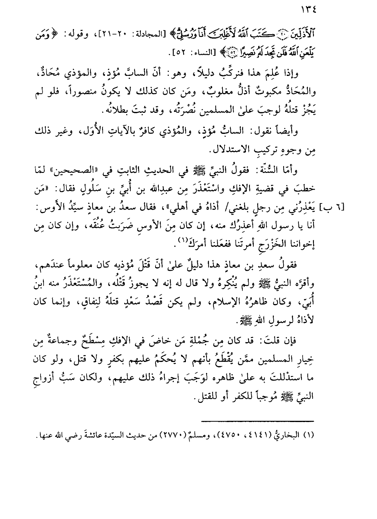 وأما السنة: فقول النبي صلى الله عليه وسلم في الحديث الثابت في "الصحيحين" لما خطب في قضية الإفك واستعذر من عبد الله بن أبي بن سلول فقال: "من يعذرني من رجل بلغني/ أذاه في أهلي"، فقال سعد بن معاذ سيد الأوس: أنا يا رسول الله أعذرك منه، إن كان من الأوس ضربت عنقه، وإن كان من إخواننا الخزرج أمرتنا ففعلنا أمرك.