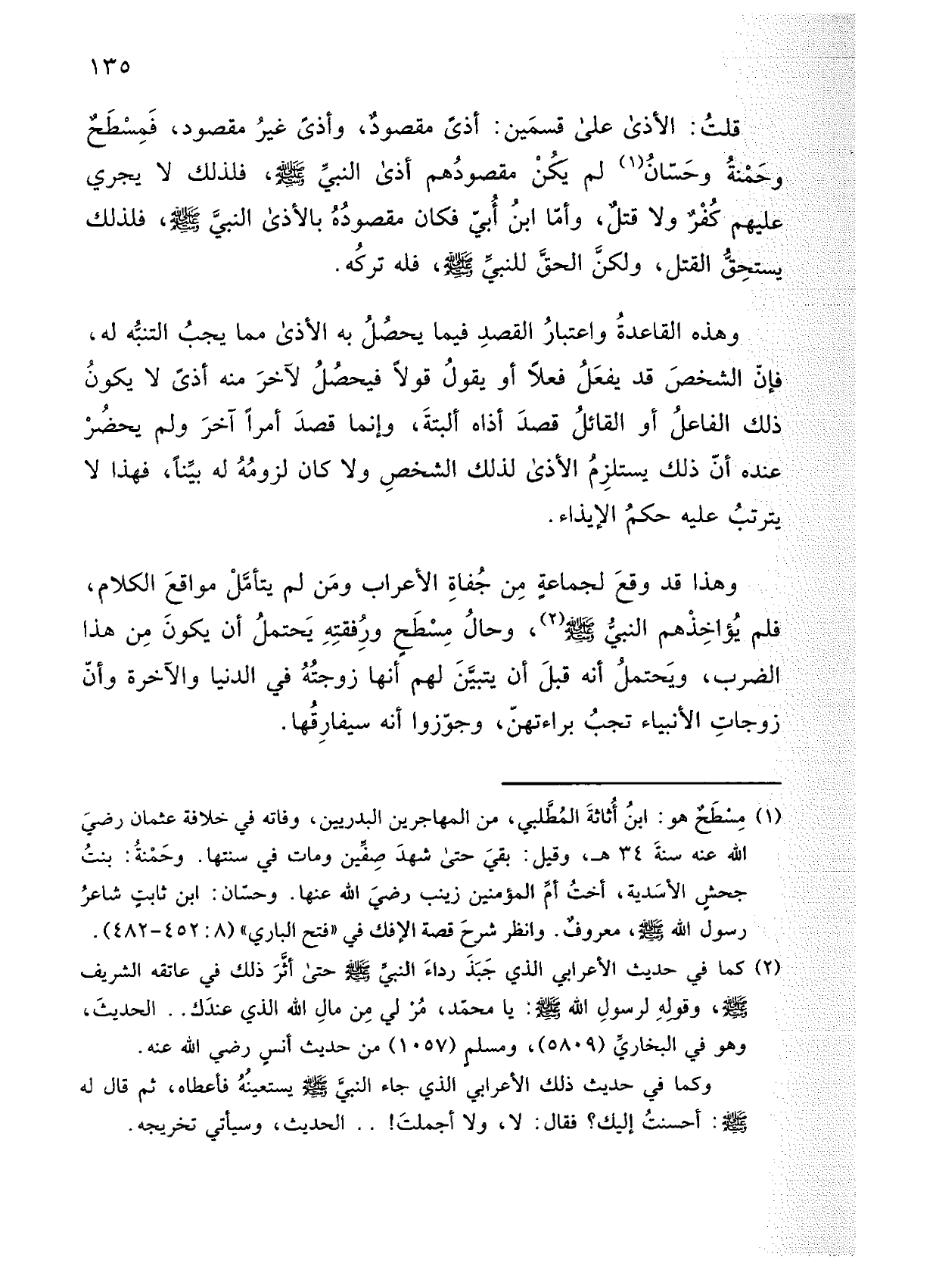 قلت: الأذى على قسمين: أذى مقصود، وأذى غير مقصود، فمسطح وحمنة وحسان لم يكن مقصودهم أذى النبي صلى الله عليه وسلم، فلذلك لا يجري عليهم كفر ولا قتل، وأما ابن أبي فكان مقصوده بالأذى النبي صلى الله عليه وسلم، فلذلك يستحق القتل، ولكن الحق للنبي صلى الله عليه وسلم، فله تركه.