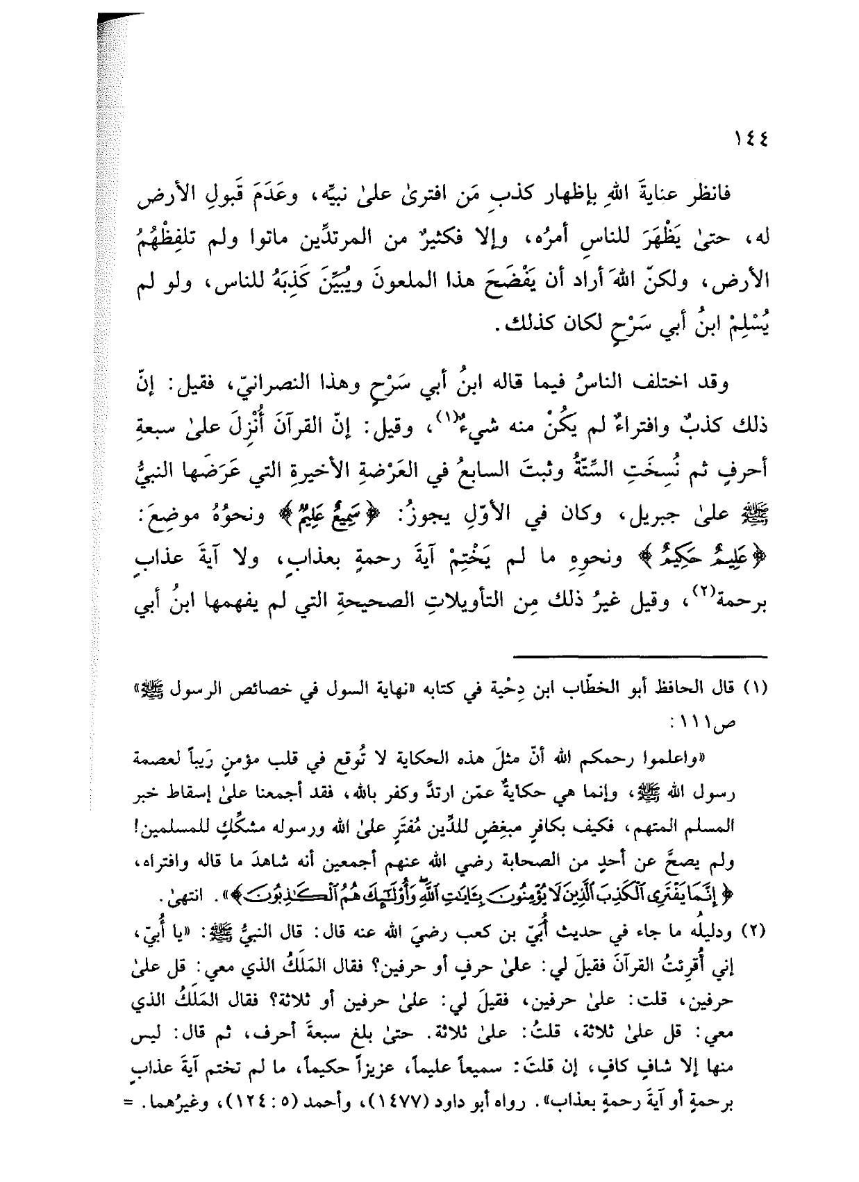 وقد اختلف الناس فيما قاله ابن أبي سرح وهذا النصراني، فقيل: إن ذلك كذب وافتراء لم يكن منه شيء، وقيل: إن القرآن أنزل على سبعة أحرف ثم نسخت الستة وثبت السابع في العرضة الأخيرة التي عرضها النبي صلى الله عليه وسلم على جبريل، وكان في الأول يجوز: (سميع عليم) ونحوه موضع: (عليم حكيم) ونحوه ما لم يختم آية رحمة بعذاب، ولا آية عذاب برحمة، وقيل غير ذلك من التأويلات الصحيحة التي لم يفهمها ابن أبي