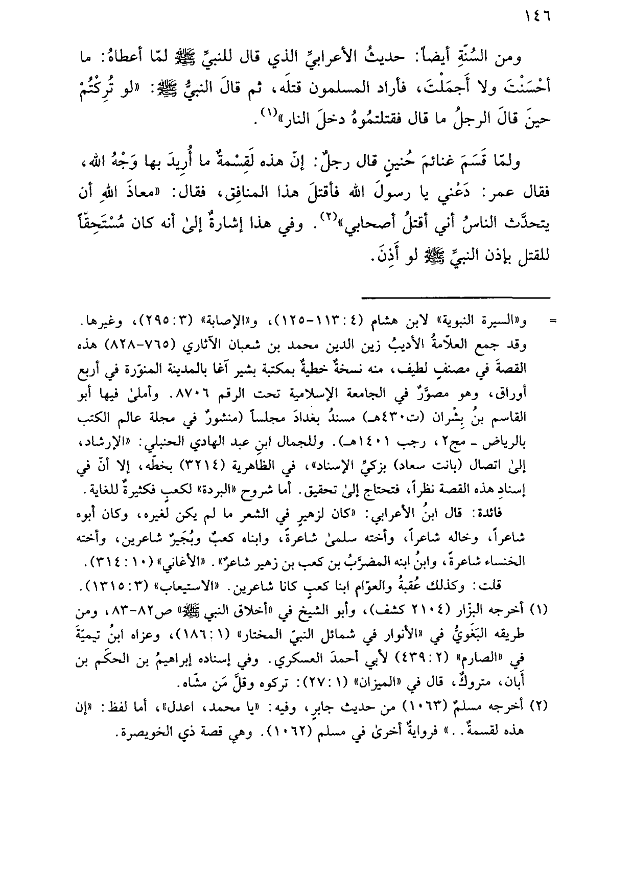 ومن السنة أيضًا: حديث الأعرابي الذي قال للنبي صلى الله عليه وسلم لما أعطاه: ما أحسنت ولا أجملت، فأراد المسلمون قتله، ثم قال النبي صلى الله عليه وسلم: "لو تركتم حين قال الرجل ما قال فقتلتموه دخل النار".