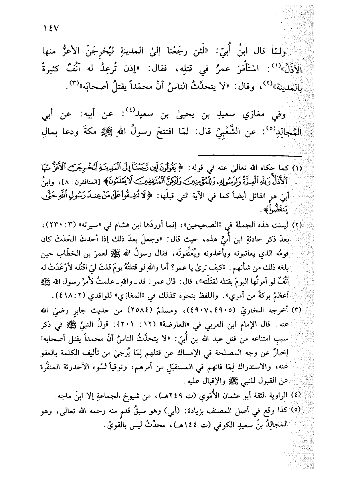 ولما قال ابن أبي: "لئن رجعنا إلى المدينة ليخرجن الأعز منها الأذل": استأمر عمر في قتله، فقال: "إذن ترعد له آنف كثيرة بالمدينة"، وقال "لا يتحدث الناس أن محمدًا يقتل أصحابه".
