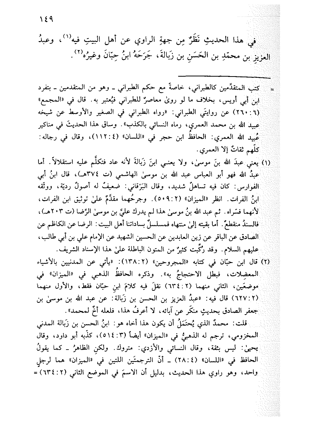 في هذا الحديث نظر من جهة الراوي عن أهل البيت فيه، وعبد العزيز بن محمد بن الحسن بن زبالة، جرحه ابن حبان وغيره.