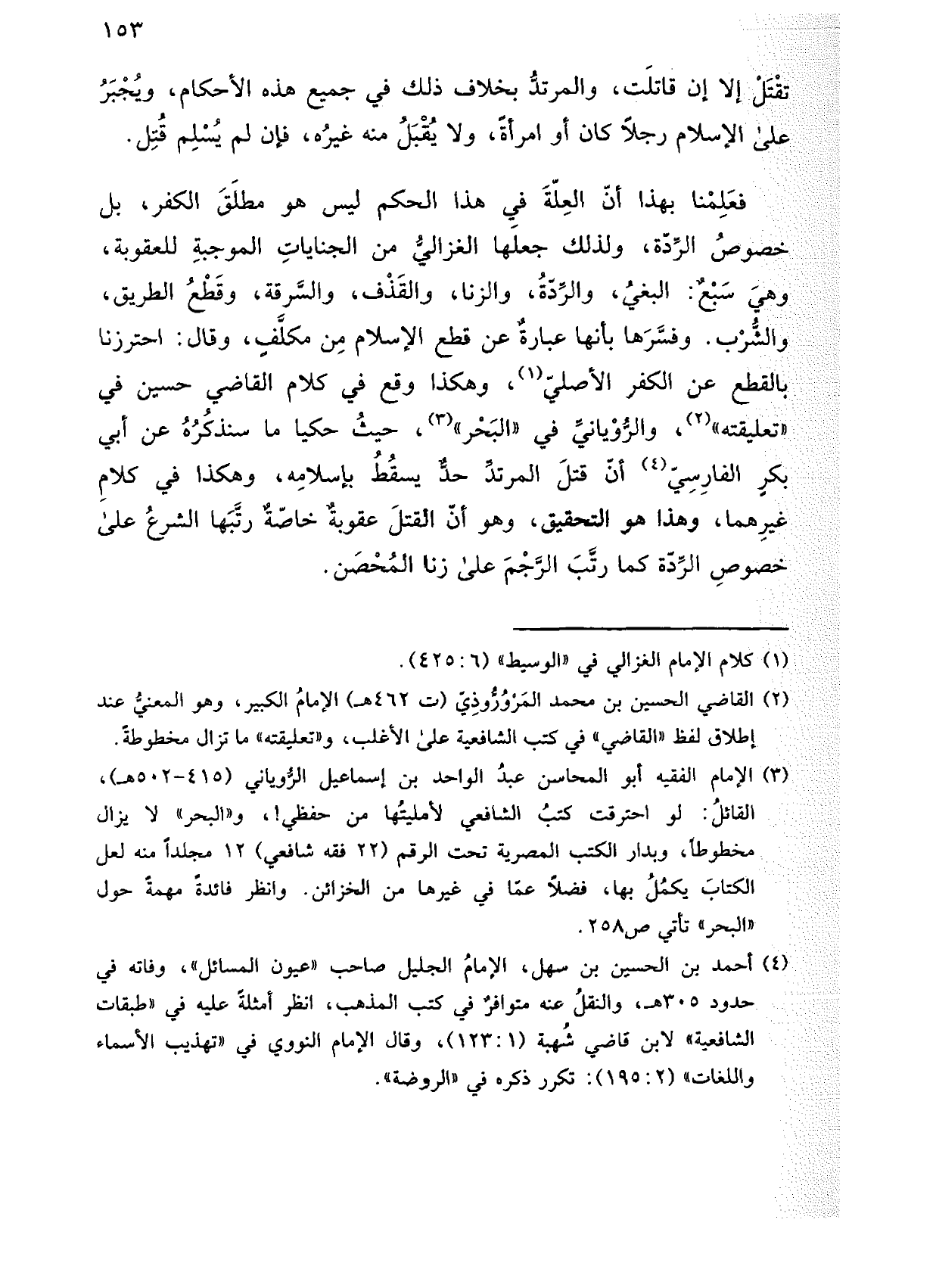 فعلمنا بهذا أن العلة في هذا الحكم ليس هو مطلق الكفر، بل خصوص الردة، ولذلك جعلها الغزالي من الجنايات الموجبة للعقوبة، وهي سبع: البغي، والردة، والزنا، والقذف، والسرقة، وقطع الطريق، والشرب. وفسرها بأنها عبارة عن قطع الإسلام من مكلف، وقال: احترزنا بالقطع عن الكفر الأصلي، وهكذا وقع في كلام القاضي حسين في "تعليقته"، والروياني في "البحر"، حيث حكيا ما سنذكره عن أبي بكر الفارسي أن قتل المرتد حد يسقط بإسلامه، وهكذا في كلام غيرهما، وهذا هو التحقيق، وهو أن القتل عقوبة خاصة رتبها الشرع على خصوص الردة كما رتب الرجم على زنا المحصن.