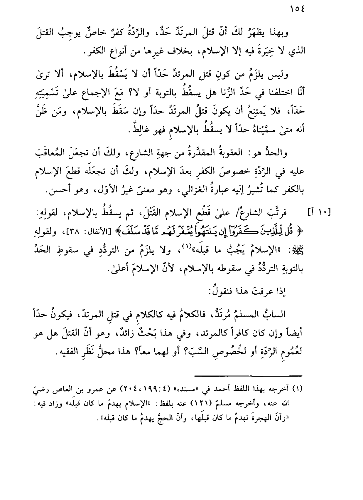 وليس يلزم من كون قتل المرتد حدًا أن لا يسقط بالإسلام، ألا ترى أنا اختلفنا في حد الزنا هل يسقط بالتوبة أو لا؟ مع الإجماع على تسميته حدًا، فلا يمتنع أن يكون قتل المرتد حدًا وإن سقط بالإسلام، ومن ظن أنه متى سميناه حدًا لا يسقط بالإسلام فهو غالط.