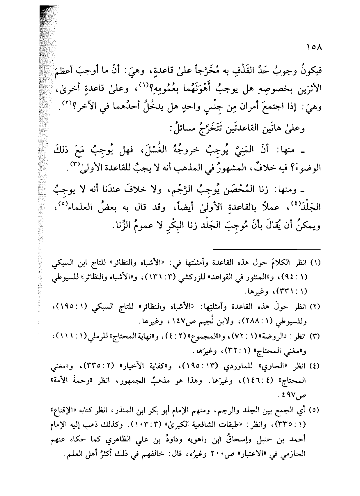 فيكون وجوب حد القذف به مخرجًا على قاعدة، وهي: أن ما أوجب أعظم الأثرين بخصوصه هل يوجب أهونهما بعمومه؟، وعلى قاعدة أخرى، وهي: إذا اجتمع أمران من جنس واحد هل يدخل أحدهما في الآخر؟.