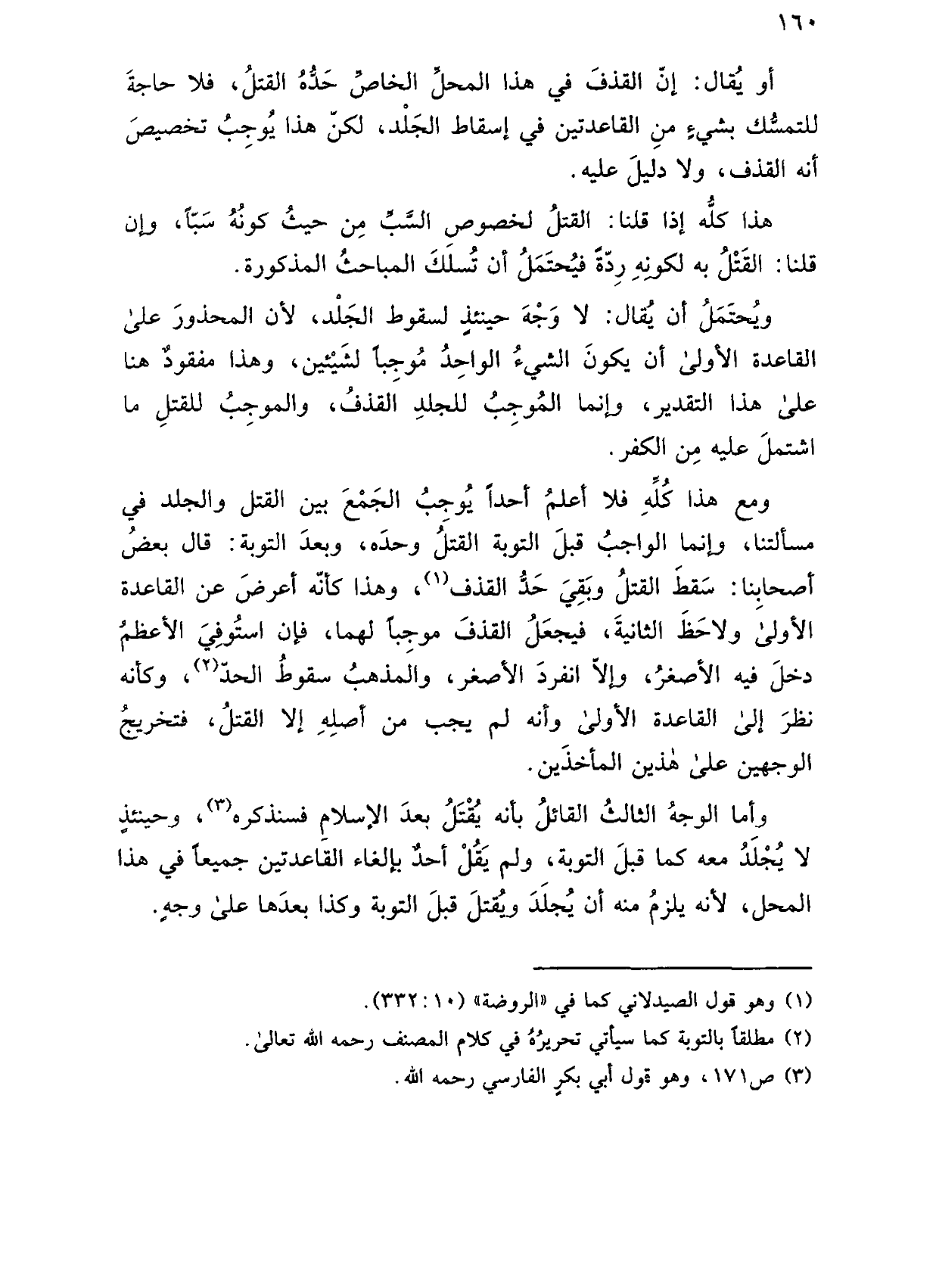 ويحتمل أن يقال: لا وجه حينئذ لسقوط الجلد، لأن المحذور على القاعدة الأولى أن يكون الشيء الواحد موجبًا لشيئين، وهذا مفقود هنا على هذا التقدير، وإنما الموجب للجلد القذف، والموجب للقتل ما اشتمل عليه من الكفر.