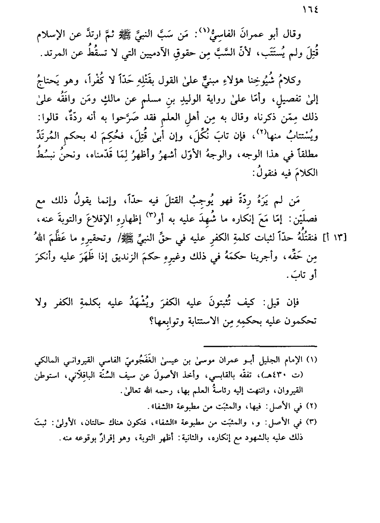 من لم يره ردة فهو يوجب القتل فيه حدًا، وإنما يقول ذلك مع فصلين: إما مع إنكاره ما شهد عليه به أو إظهاره الإقلاع والتوبة عنه، فنقتله حدًا لثبات كلمة الكفر عليه في حق النبي صلى الله عليه وسلم/ وتحقيره ما عظم الله من حقه، وأجبرينا حكمه في ذلك وغيره حكم الزنديق إذا ظهر عليه وأنكر أو تاب.