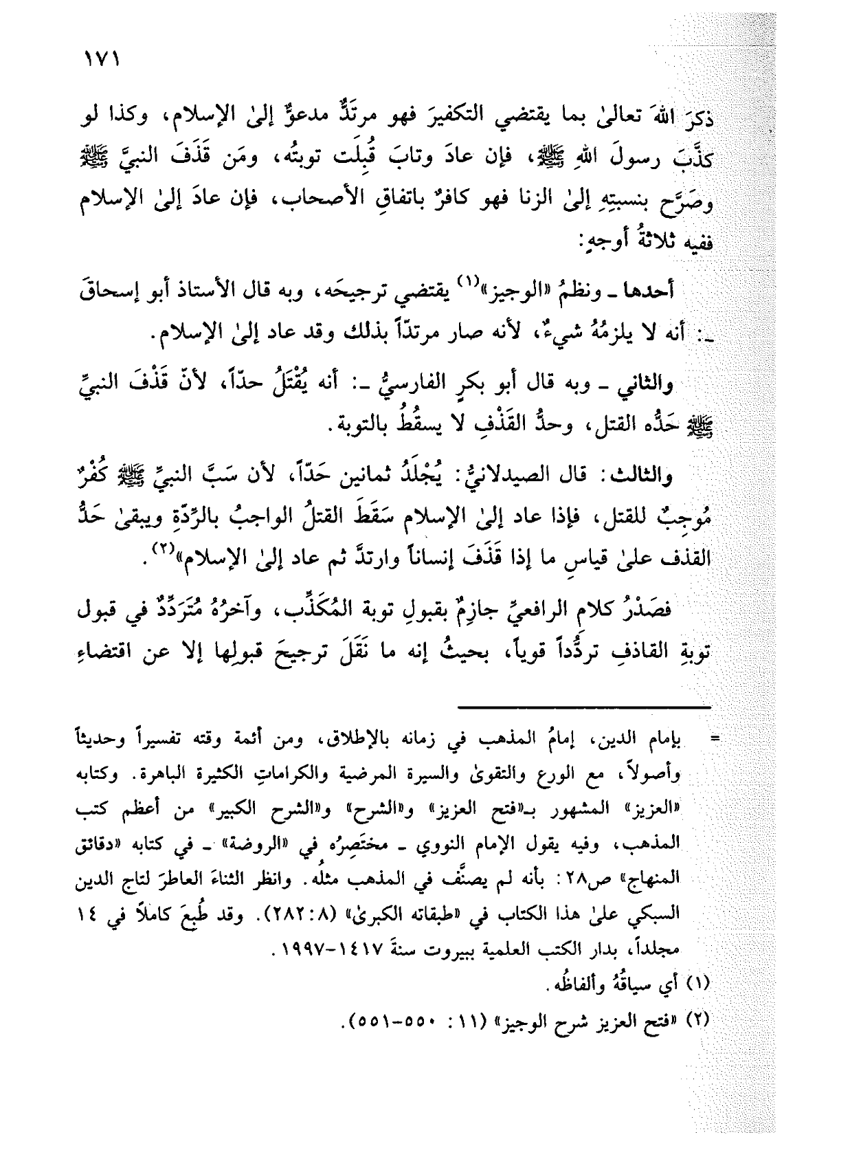 والثالث: قال الصيدلاني: يجلد ثمانين حدًا، لأن سب النبي صلى الله عليه وسلم كفر موجب للقتل، فإذا عاد إلى الإسلام سقط القتل الواجب بالردة ويبقى حد القذف على قياس ما إذا قذف إنسانًا وارتد ثم عاد إلى الإسلام".