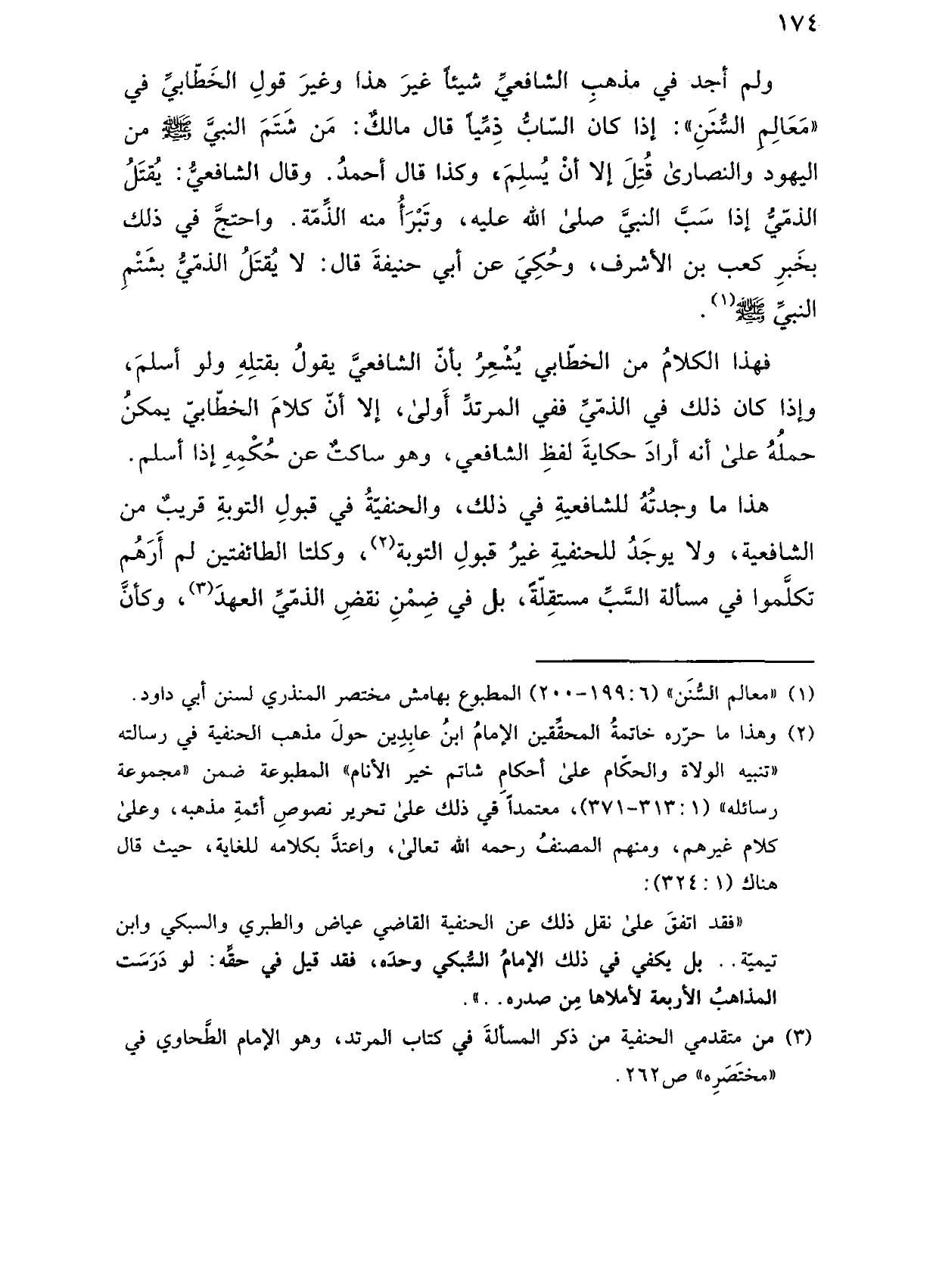 فهذا الكلام من الخطابي يشعر بأن الشافعي يقول بقتله ولو أسلم، وإذا كان ذلك في الذمي ففي المرتد أولى، إلا أن كلام الخطابي يمكن حمله على أنه أراد حكاية لفظ الشافعي، وهو ساكت عن حكمه إذا أسلم.