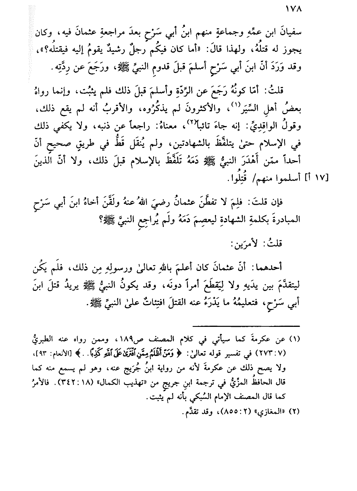 سفيان ابن عمه وجماعة منهم ابن أبي سرح بعد مراجعة عثمان فيه، وكان يجوز له قتله، ولهذا قال: "أما كان فيكم رجل رشيد يقوم إليه فيقتله؟ "، وقد ورد أن ابن أبي سرح أسلم قبل قدوم النبي صلى الله عليه وسلم، ورجع عن ردته.