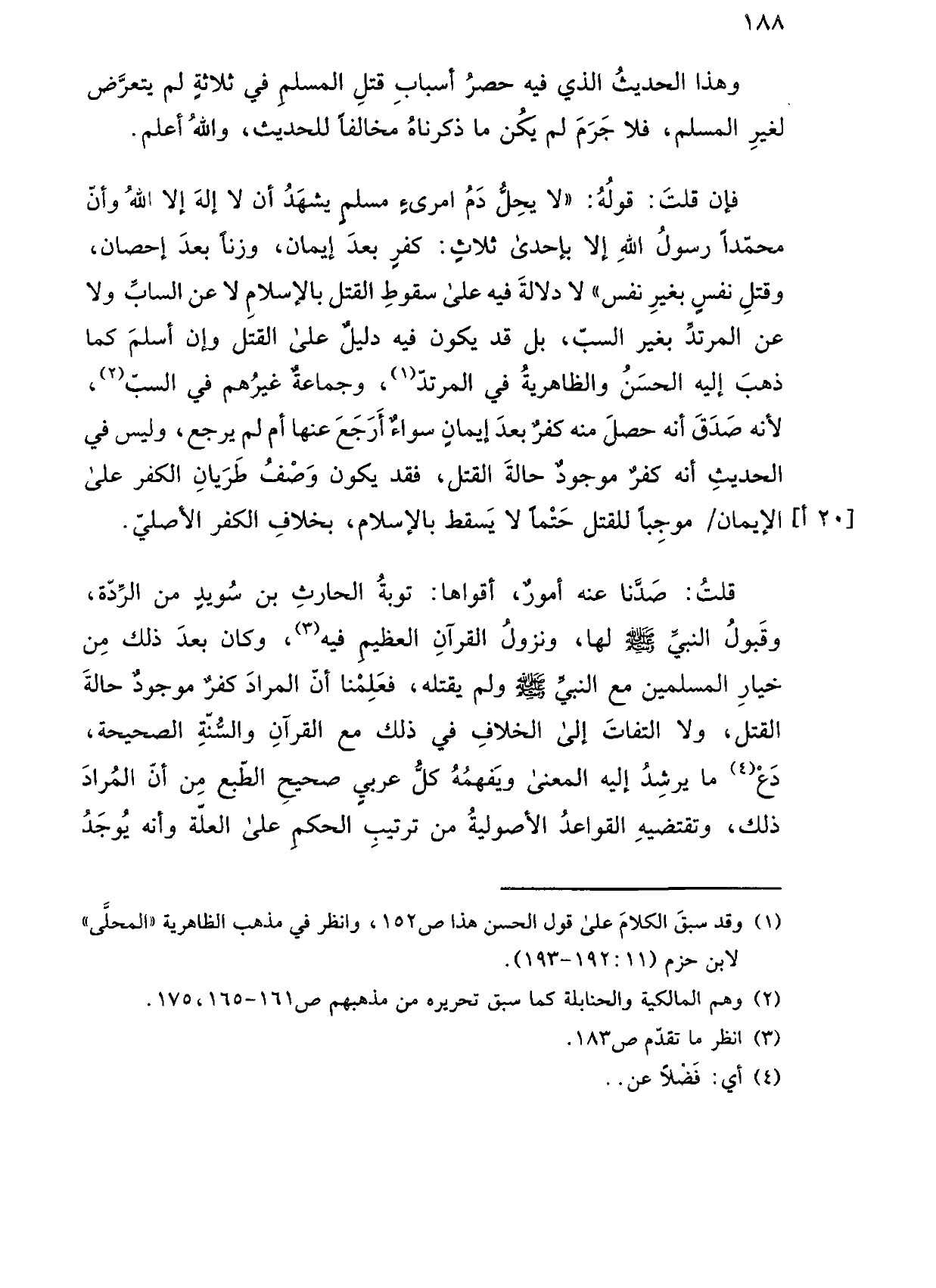 قلت: صدنا عنه أمور، أقواها: توبة الحارث بن سويد من الردة، وقبول النبي صلى الله عليه وسلم لها، ونزول القرآن العظيم فيه، وكان بعد ذلك من خيار المسلمين مع النبي صلى الله عليه وسلم ولم يقتله، فعلمنا أن المراد كفر موجود حالة القتل، ولا التفات إلى الخلاف في ذلك مع القرآن والسنة الصحيحة، دع ما يرشد إليه المعنى ويفهمه كل عربي صحيح الطبع من أن المراد ذلك، وتقتضيه القواعد الأصولية من ترتيب الحكم على العلة وأنه يوجد