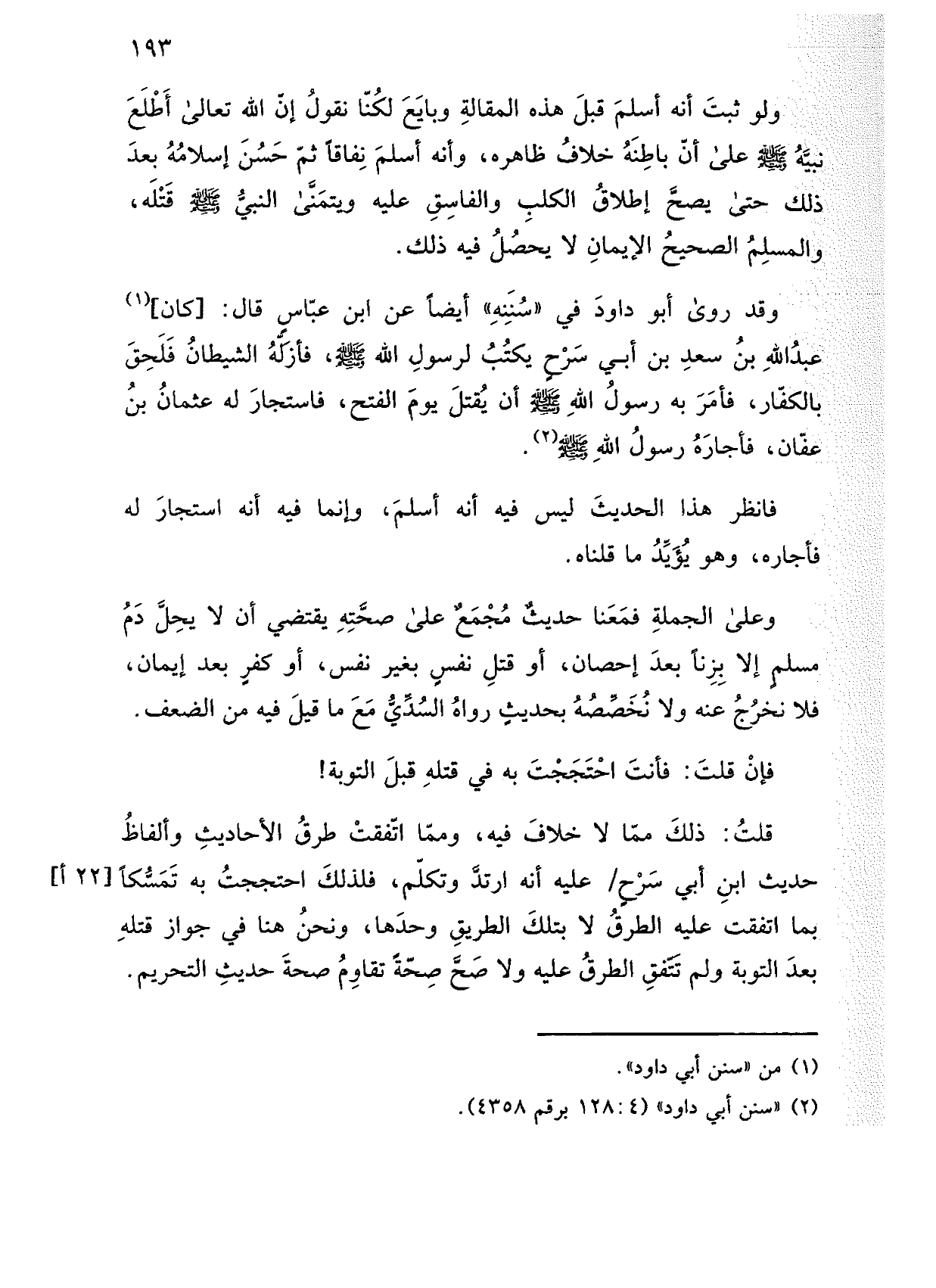 وقد روى أبو داود في "سننه" أيضًا عن ابن عباس قال: [كان] عبد الله بن سعد بن أبي سرح يكتب لرسول الله صلى الله عليه وسلم، فأزله الشيطان فلحق بالكفار، فأمر به رسول الله صلى الله عليه وسلم أن يقتل يوم الفتح، فاستجار له عثمان بن عفان، فأجازه رسول الله صلى الله عليه وسلم.