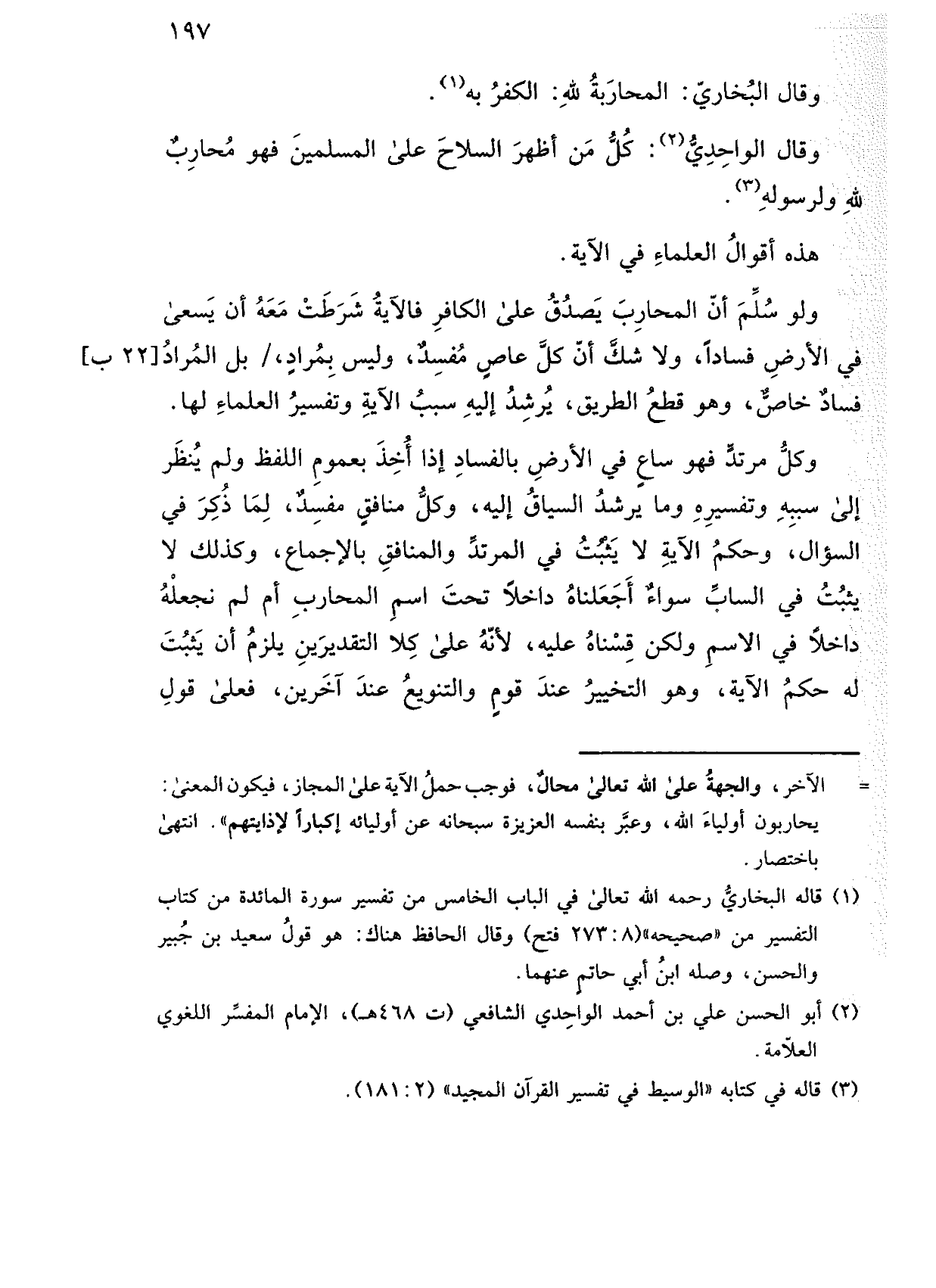ولو سلم أن المحارب يصدق على الكافر فالآية شرطت معه أن يسعى في الأرض فسادًا، ولا شك أن كل عاصٍ مفسد، وليس بمراد،/ بل المراد فساد خاص، وهو قطع الطريق، يرشد إليه سبب الآية وتفسير العلماء لها.