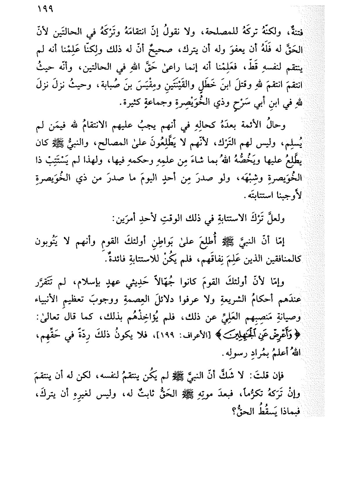 وحال الأئمة بعده كحاله في أنهم يجب عليهم الانتقام لله فيمن لم يسلم، وليس لهم الترك، لأنهم لا يطلعون على المصالح، والنبي صلى الله عليه وسلم كان يطلع عليه ويخصه الله بما شاء من علمه وحكمه فيها، ولهذا لم يستتب ذا الخويصرة وشبهه، ولو صدر من أحد اليوم ما صدر من ذي الخويصرة لأوجبنا استتابته.