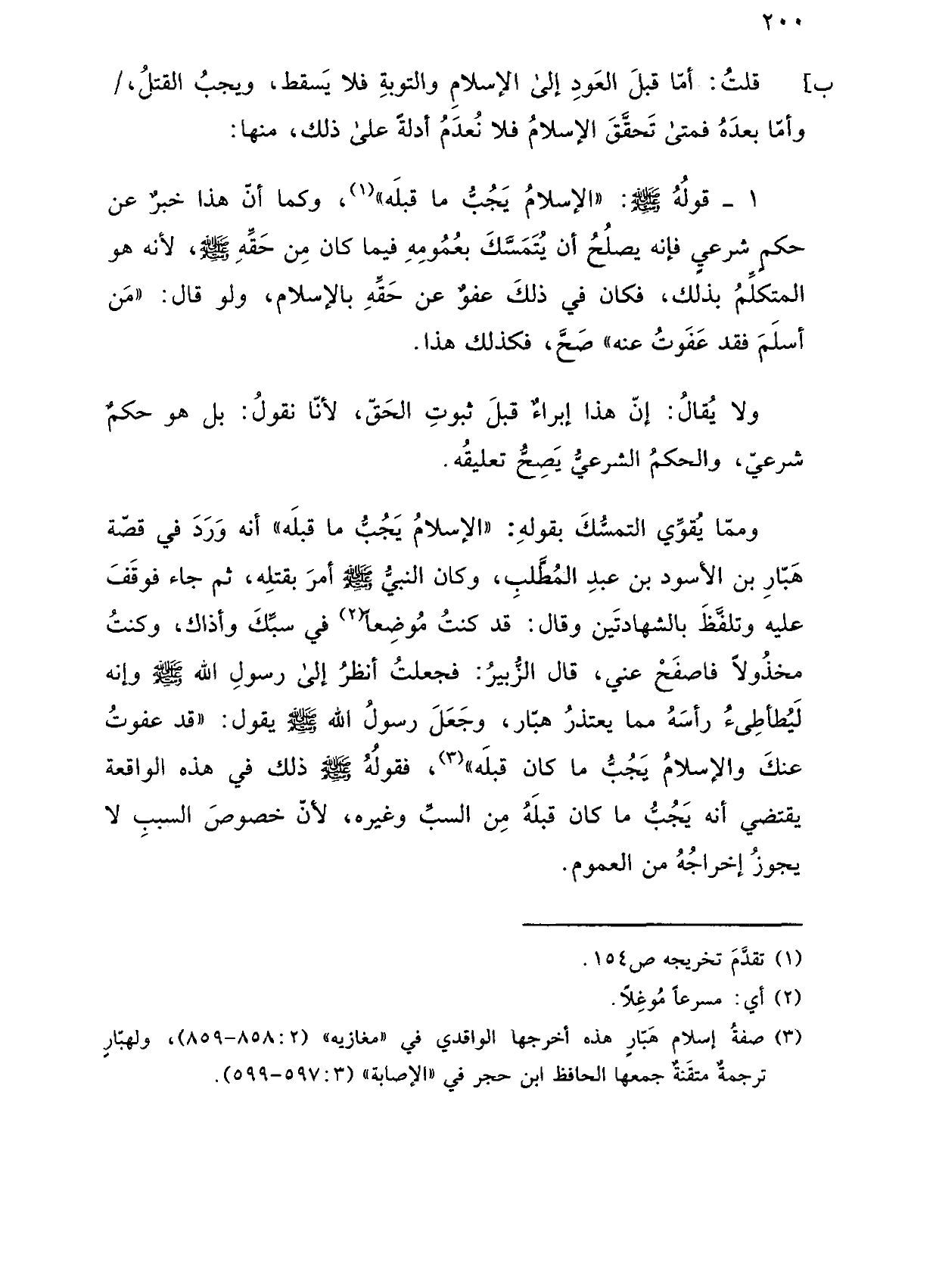 ومما يقوي التمسك بقوله: "الإسلام يجب ما قبله" أنه ورد في قصة هبار بن الأسود بن عبد المطلب، وكان النبي صلى الله عليه وسلم أمر بقتله، ثم جاء فوقف عليه وتلفظ بالشهادتين وقال: قد كنت موضعًا في سبك وأذاك، وكنت محذولاً فاصفح عني، قال الزبير: فجعلت أنظر إلى رسول الله صلى الله عليه وسلم وإنه ليطأطئ رأسه مما يعتذر هبار، وجعل رسول الله صلى الله عليه وسلم يقول: "قد عفوت عنك والإسلام يجب ما كان قبله"، فقوله صلى الله عليه وسلم ذلك في هذه الواقعة يقتضي أنه يجب ما كان قبله من السب وغيره، لأن خصوص السبب لا يجوز إخراجه من العموم.