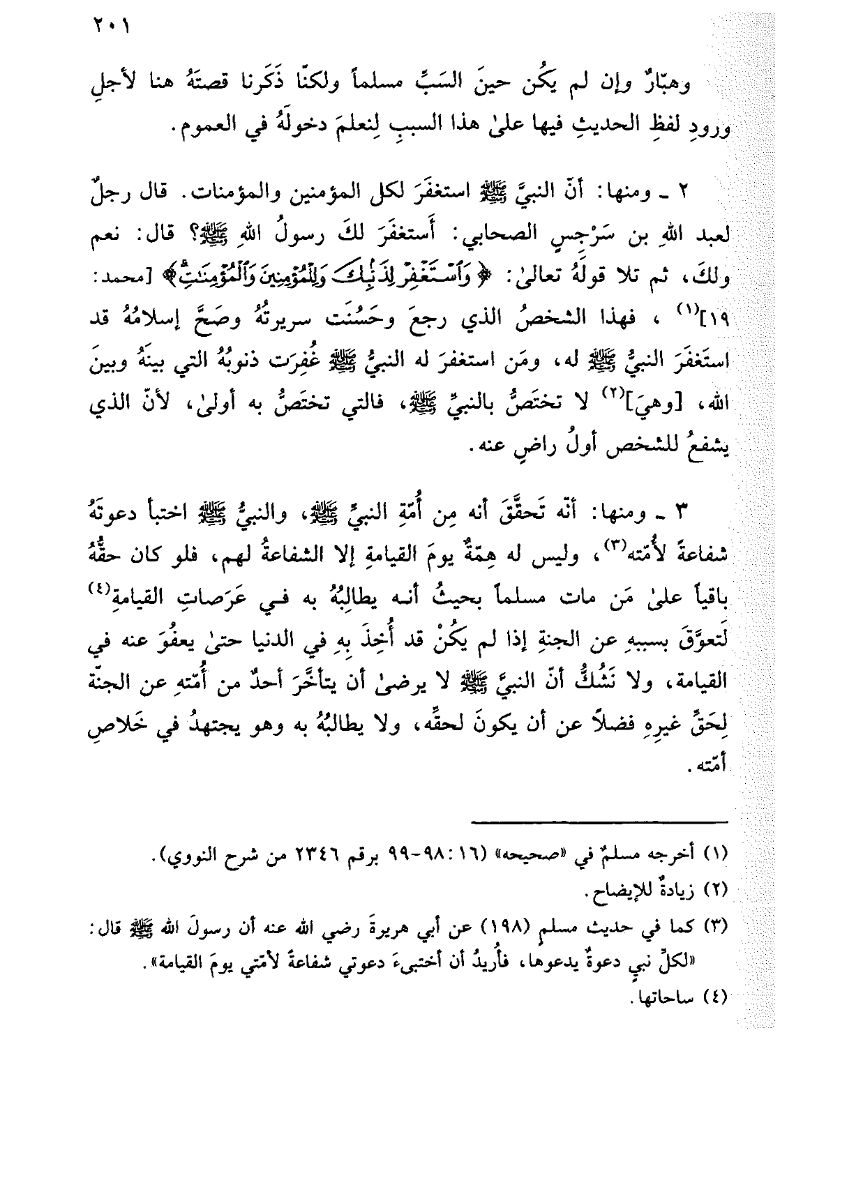 2 - ومنها: أن النبي صلى الله عليه وسلم استغفر لكل المؤمنين والمؤمنات. قال رجل لعبد الله بن سرجس الصحابي: أستغفر لك رسول الله صلى الله عليه وسلم؟ قال: نعم ولك، ثم تلا قوله تعالى: (واستغفر لذنبك وللمؤمنين والمؤمنات) [محمد: 19]، فهذا الشخص الذي رع وحسنت سريرته وصح إسلامه قد استغفر النبي صلى الله عليه وسلم له، ومن استغفر له النبي صلى الله عليه وسلم غفرت ذنوبه التي بينه وبين الله، [وهي] لا تختص بالنبي صلى الله عليه وسلم، فالتي تختص به أولى، لأن الذي يشفع للشخص أول راضٍ عنه.